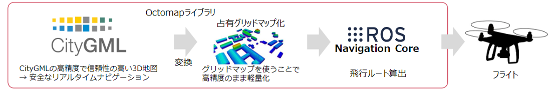 一般的なドローンではGPSを使用して自己位置を把握していることが多いものの、GPSでは受信状態や、大気の影響、電波の反社(マルチパス)によって数メートルから数十メートル単位のズレが発生することもありえます。そのため、LEVEL4での飛行が当たり前になり、都市部の中をドローンが飛び交う未来において、誤差が大きいGPSのみに依存すると、ドローンが周囲の建物にぶつかってしまうことなどが予想されます。そこで、ドローンに取り付けられたLiDARセンサーとステレオカメラから取得された周辺のスキャンデータを使って、飛行中のリアルタイム周辺測位を行いました。CityGMLデータとリアルタイム周辺測位2つを照らし合わせることで、SLAM単体よりも精度高く自己位置の推定を可能にするシステムの実証を行いました。