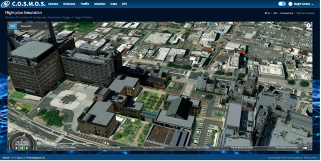 過去の取り組みでは、プロジェクトプラトーの立体情報を持った都市空間の中で、都市の空域を飛行するドローンのフライトシュミレーターを開発いたしました。この技術を弊社の運航管理サービスシステム「COSMOS*」に組み込むことで、ビル群が乱立する複雑な都市上空においてもドローンのオペレーションリスクを飛行前に検証することが可能です。また安全が担保された航行ルートは、「COSMOS」により実際のフライトルートとして使用することもできます。