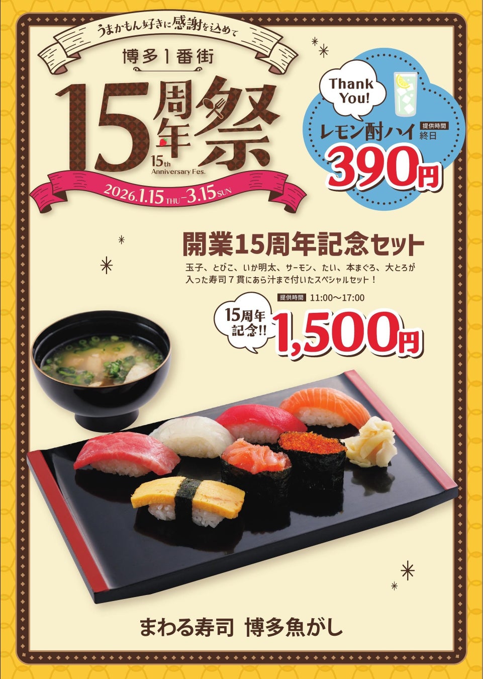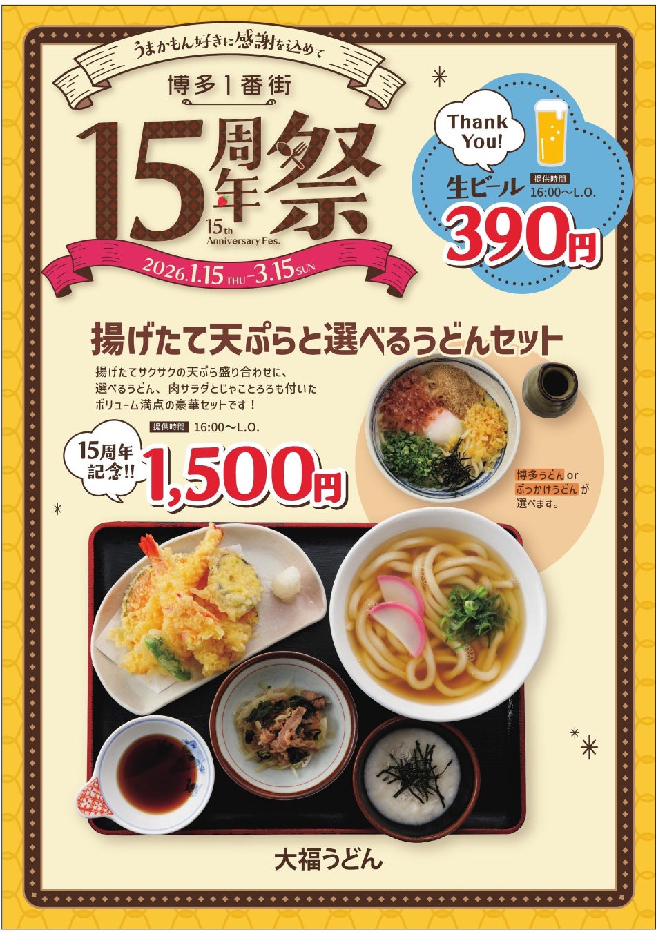 「博多1番街15周年祭」開催!!JR博多駅地下1階の飲食街「博多1番街」で、1,500円均一特別メニューや、スクラッチキャンペーンを実施します。