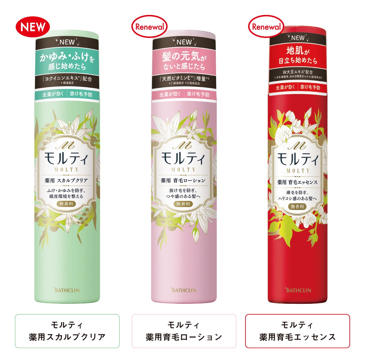 このたび、年齢を重ねることで変化する悩みに丁寧に対応するため、殺菌成分で頭皮環境を整え、ふけ、かゆみを防ぎ、快適な頭皮へ導く「モルティ 薬用スカルプクリア」を新発売します。また、既存の2アイテム(薬用育毛ローション・薬用育毛エッセンス)は保湿成分の配合など、処方をアップデートし、パッケージデザインを一新してリニューアルいたします。