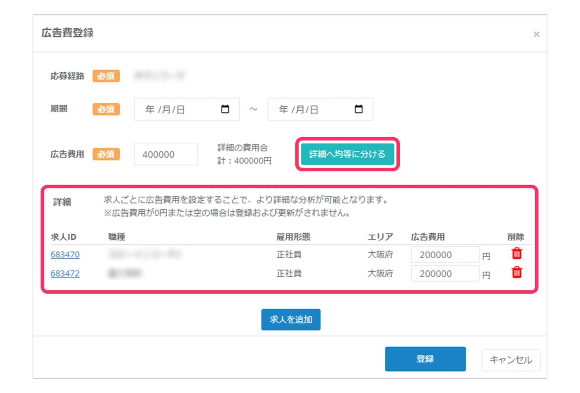 アップデート後は、「使用媒体一覧」に紐づけられている求人を、ATSレポート画面の広告費用の初期値として設定できるようになりました。 また、広告費用を均等分配するボタンを追加し、求人ごとの個別入力不要で簡単に広告費が登録できるようになりました。 これらのアップデートにより、広告費用登録の工数が大幅に削減され、業務効率の改善が期待されます。