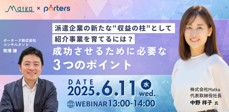 人材ビジネス向けマッチングシステムを提供するポーターズ株式会社(東京証券取引所グロース. 証券コード5126、東京都港区、代表 西森 康二)は、株式会社Matkaと共同で「派遣企業の新たな“収益の柱”として紹介事業を育てるには?成功させるために必要な3つのポイント」セミナーを2025年6月11日(水)13:00~オンラインで開催いたします。