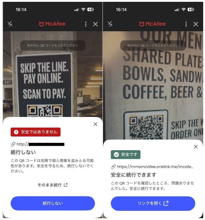 メニュー表、駐車場の精算機、ポスター、宅配の荷物など、一見問題ないように見えるQRコードにも、危険が潜んでいる可能性があります。マカフィーの「QRコード詐欺チェッカー」は、QRコードを読み取る際に、そのコードが安全かどうかを瞬時に判断します。