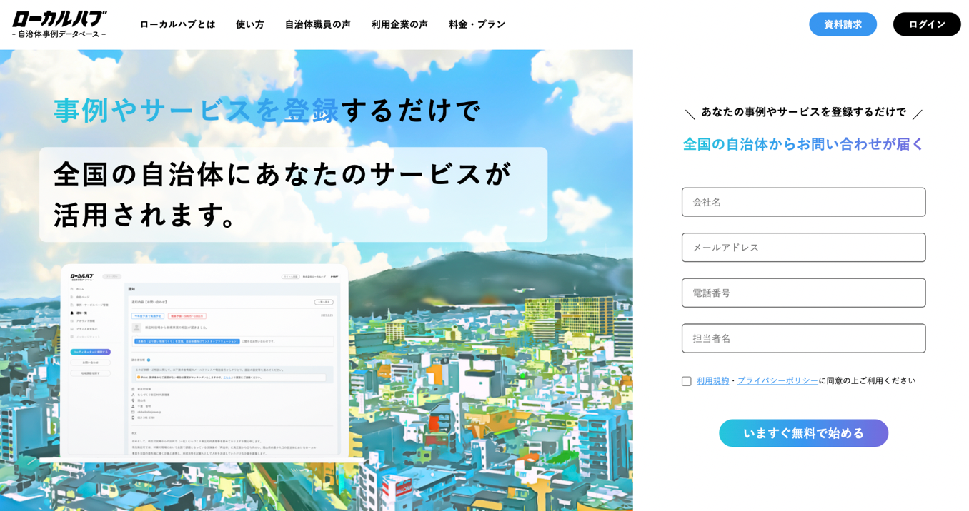 自治体事例データベース|ローカルハブ(事業開発者:佐々木大地)を提供する株式会社クラウドシエン(本社:広島県広島市、代表取締役:神原 翔吾)は、2023年02月23日(木)より、ローカルハブβ1.1版のリリースとして企業が自社サービスや導入事例を無料登録するだけで、全国の自治体からお問い合わせがくる機能を追加しました。本リリースと併せて、官民連携に関わる方へ協業パートナーの募集を開始いたします。