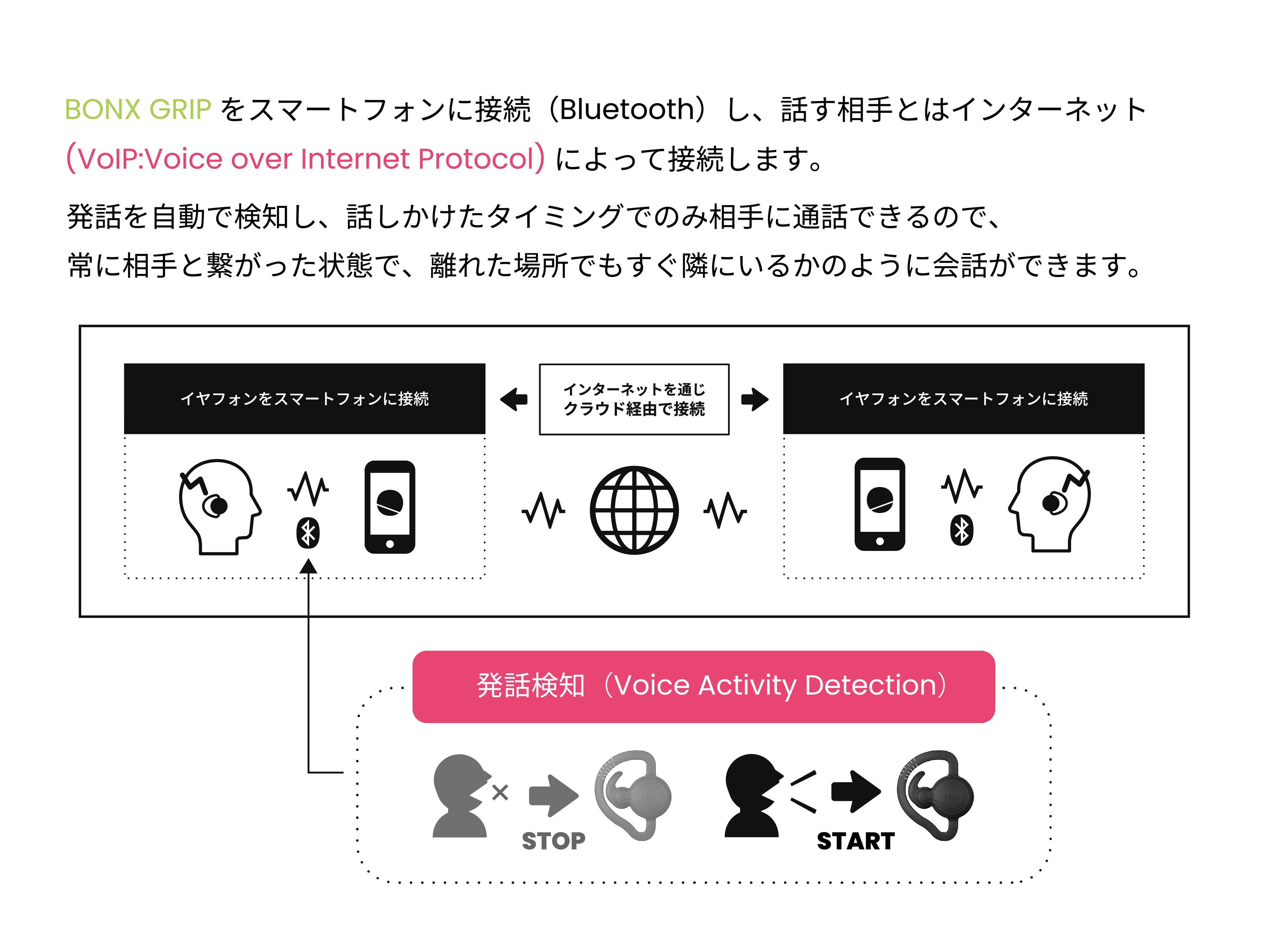 対象はスマートフォンのインターネット回線を使ったグループ通話ソリューション「BONX WORK」、専用イヤフォン「BONX Grip」「BONX mini」です。なお、今回提供開始を記念しキャンペーンも行います。