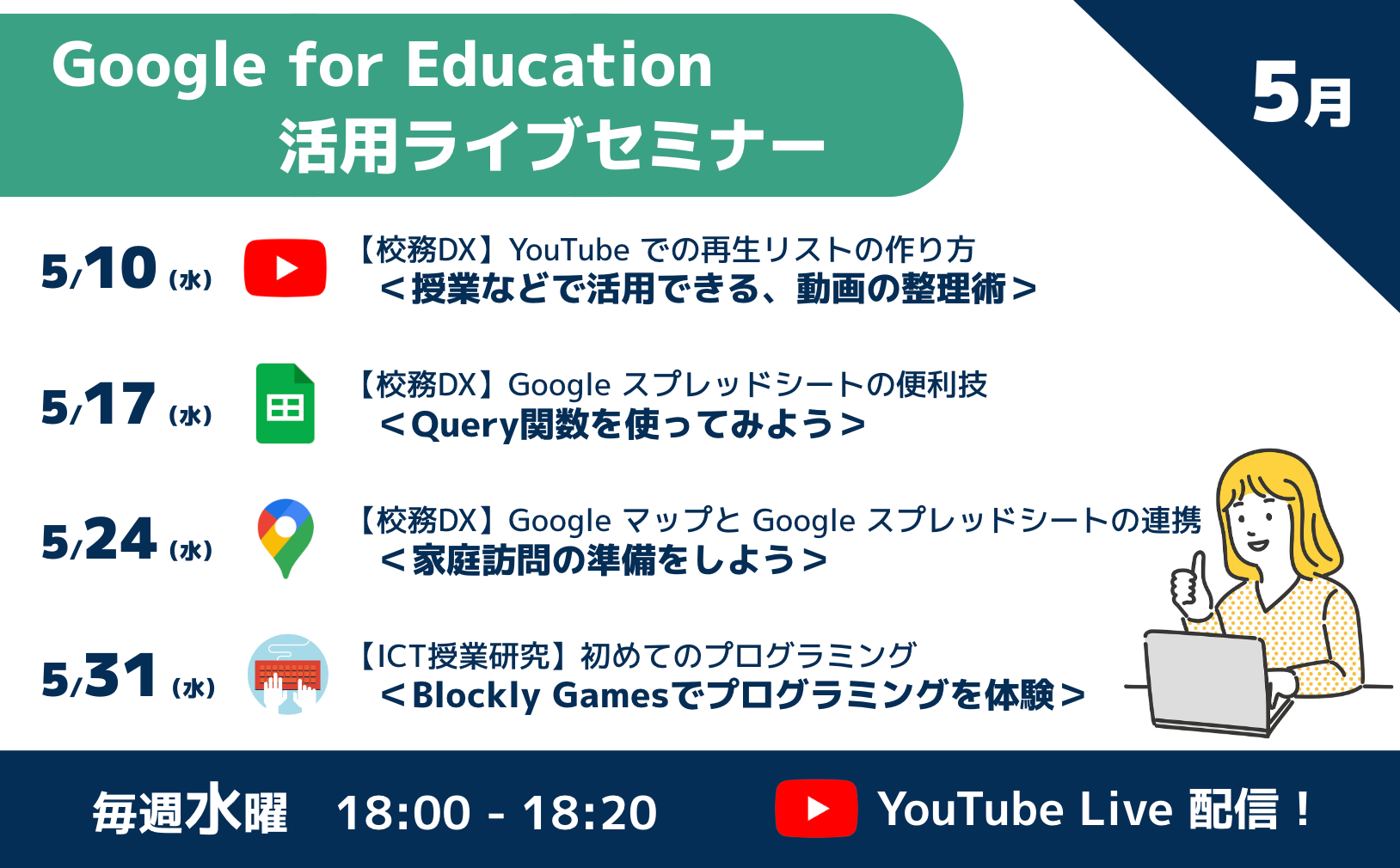 ● 5月10日(水)【校務DX】 YouTube での再生リストの作り方 <授業などで活用できる、動画の整理術> ● 5月17日(水)【校務DX】 Google スプレッドシートの便利技 <Query関数を使ってみよう> ● 5月24日(水)【校務DX】 Google マップと Google スプレッドシートの連携 <家庭訪問の準備をしよう> ● 5月31日(水)【ICT授業研究】 初めてのプログラミング <Blockly Gamesでプログラミングを体験> ※ すべて18:00〜18:20開催 |