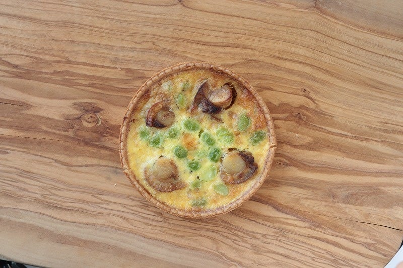 「帆立と枝豆のキッシュ」は帆立のしっかりした旨味をさらに引き立てるために小豆島の醤油を合わせた、コクのある味わい。鮮やかな緑の枝豆と濃厚な帆立の食感の違いも楽しめます。