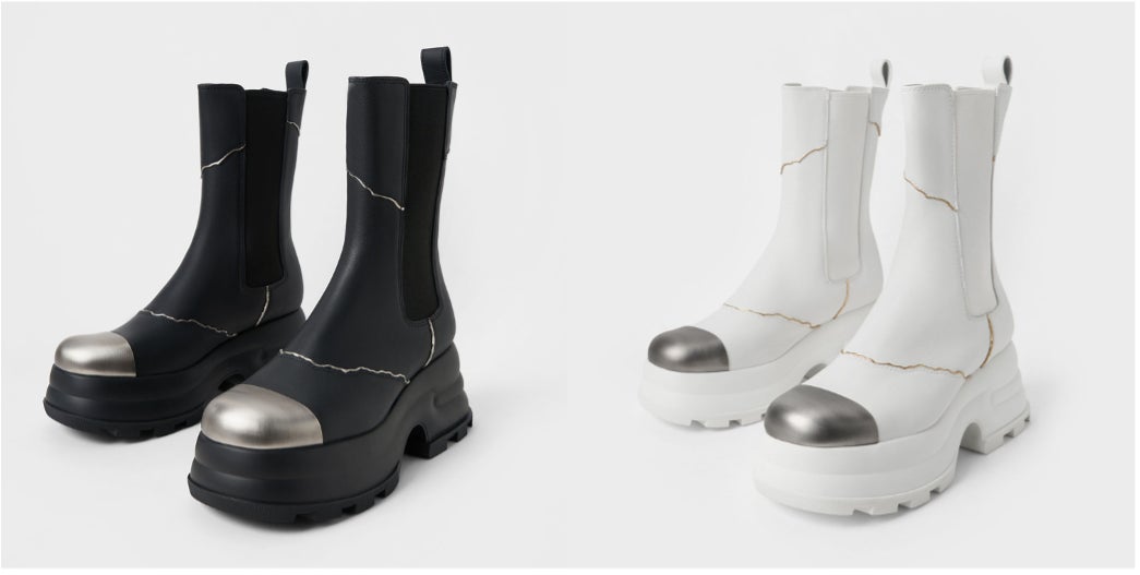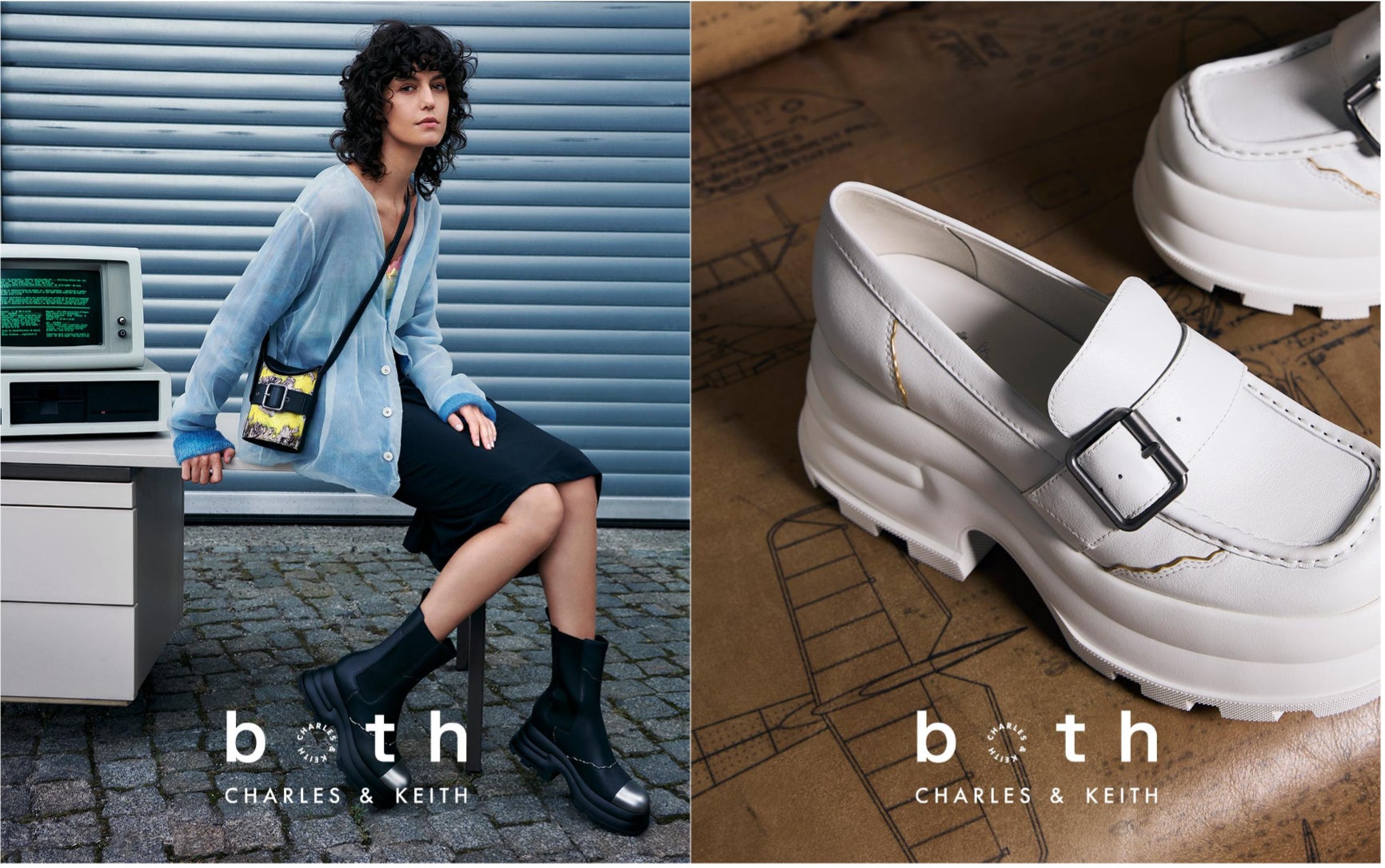 チャールズ&キースのアイコンであるチェルシーブーツとチャンキーローファーに、bothの曲線的で大胆なデザインのラバーソールが融合し、新しいシルエットに生まれ変わりました。グランジストリートスタイルにインスパイアされたプラットフォームは、従来のイメージを覆し、オンとオフの絶妙なバランスを演出します。90年代にカムデンや原宿に出没した若者のスタイルを思わせる彫刻的なシルエットも特徴的です。アッパーには、バラバラの布を重ね合わせたようなゴールドやシルバーのつなぎ目と、ハンマーで叩いたようなメタルのトゥキャップが施され、社会に対する思いや自己表現をするといったパンク精神を思わせるデザインです。