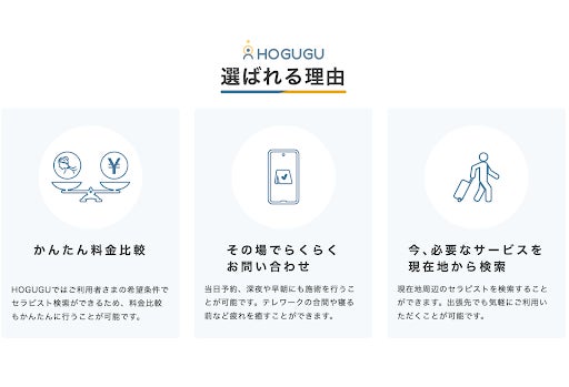 自宅やホテルなどの滞在先にセラピストをすぐ呼べる出張リラクゼーションアプリ「HOGUGU(ホググ)」(https://hogugu.com/)を提供しております。