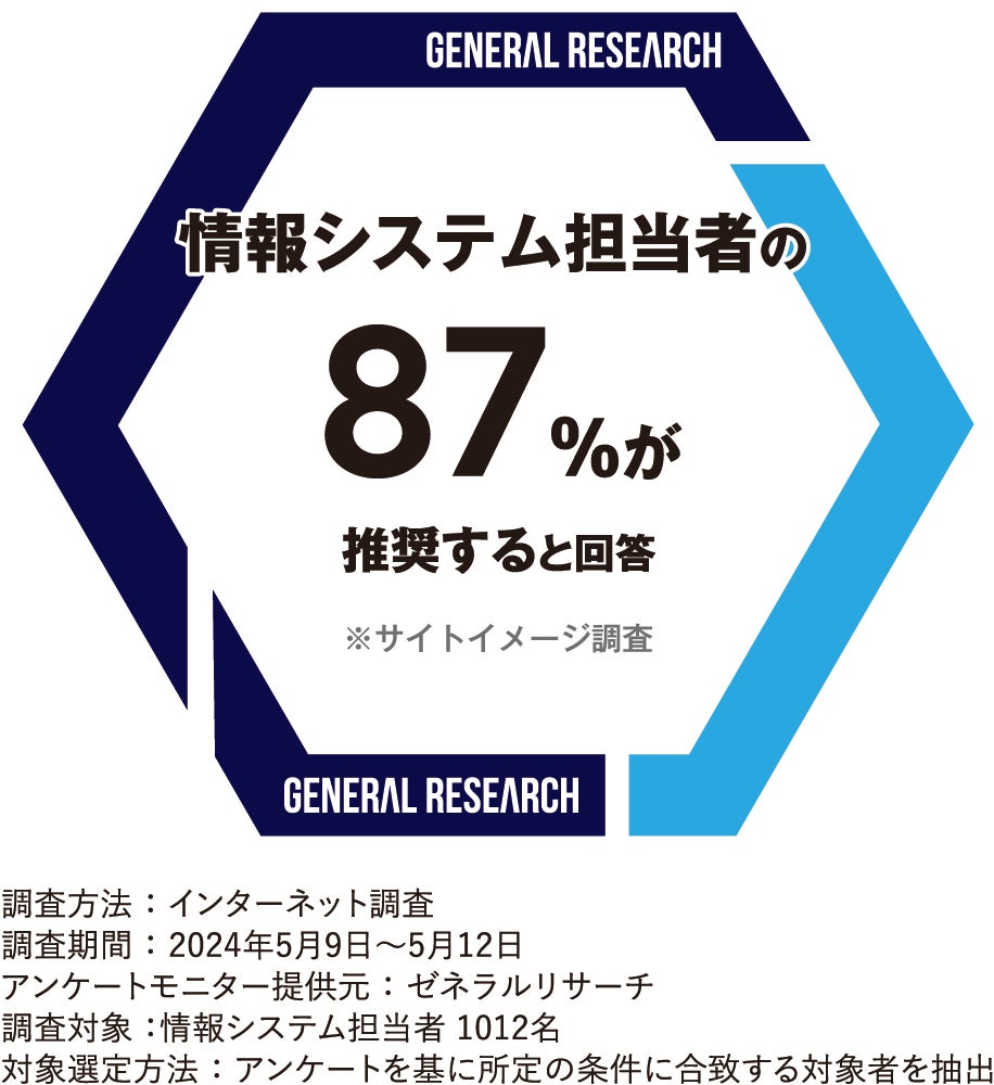 また、2024年5月に実施した調査では「情報システム担当者の87%が推奨する/テレワークをしている方の92%が安心して利⽤できる」といったご評価をいただいております。