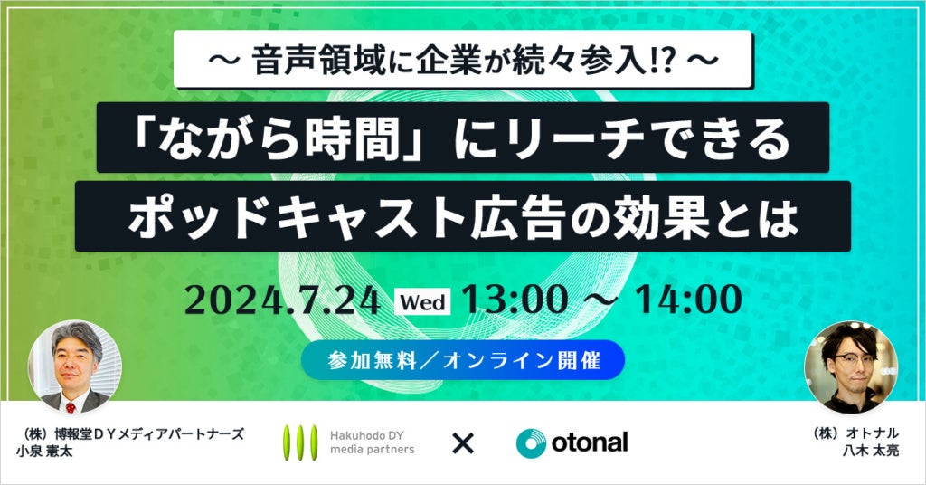 株式会社オトナル(本社:東京都中央区/代表取締役 八木太亮、以下、オトナル)と、株式会社博報堂DYメディアパートナーズ(以下、博報堂DYメディアパートナーズ)は、無料ウェビナー「音声領域に企業が続々参入!?「ながら時間」にリーチできるポッドキャスト広告の効果とは」を、2024年7月24日(水)に開催します。