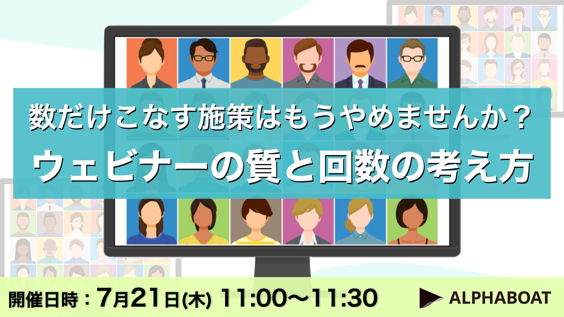 「ソーシャル領域のコミュニケーションのスペシャリスト」としてデジタルコンテンツの制作やライブ配信事業等を行うALPHABOAT合同会社(所在地:東京都渋谷区、社長:西谷 大蔵、以下「ALPHABOAT」)は、7月21日(木)11:00より企業のウェビナー担当者様向けに「数だけこなす施策はもうやめませんか?ウェビナーの質と回数の考え方」セミナーを開催いたします。
