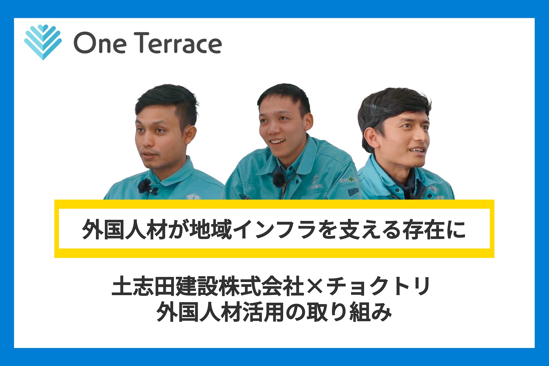 株式会社One Terrace(本社:東京都港区、代表取締役:石中達也、以下One Terrace)が運営する外国人材紹介サービス「チョクトリ」を通じて、外国人材を採用した土志田建設株式会社(本社:神奈川県横浜市、代表取締役社長:土志田領司、以下土志田建設)は、少子高齢化や建設業界の人材不足という社会課題に対応すべく、計画的な外国人材活用を進めています。このたび、採用の背景や多文化共生の取り組みについて紹介するため、企業と外国人社員双方の声を収めたインタビュー動画を公開しました。