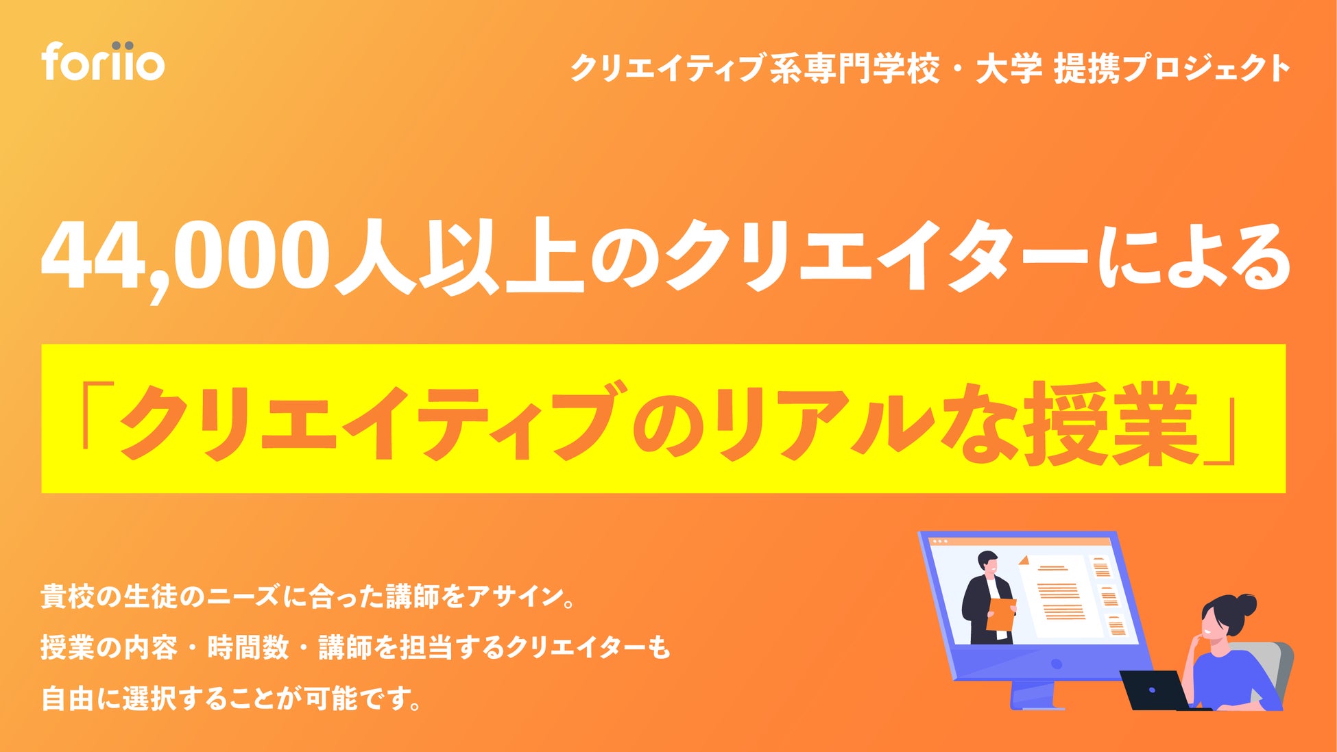 クリエイターのポートフォリオプラットフォーム「foriio」を運営する株式会社foriio(本社:東京都新宿区 / 代表取締役:山田寛仁)は、専門学校や大学の生徒に向けてクリエイターが講師として授業を行う『専門学校・大学提携プロジェクト』を本日より開催いたします。