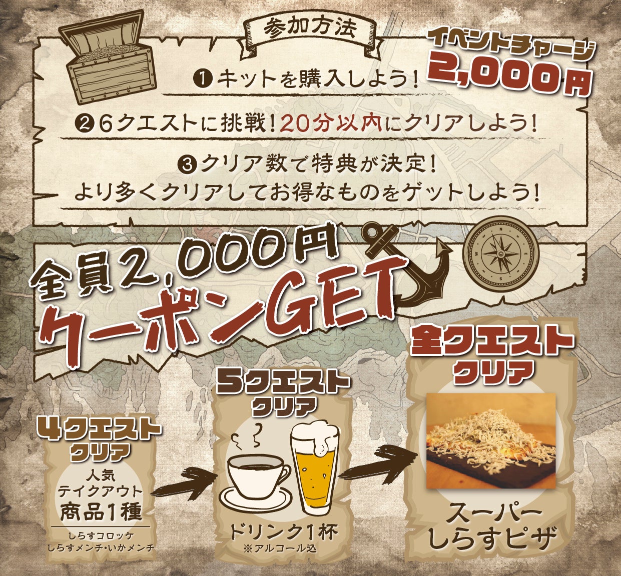 クイズはカフェのある江の島が題材になっており、出題される5つのクイズの正解を20分以内にカフェにて報告。その正解数に応じて、お得な特典を獲得できます。また最後の1問はExtra Questとなっており、見事正解するとカフェ特製の「スーパーしらすピザ」(しらす爆盛りピザ)を獲得することができます。