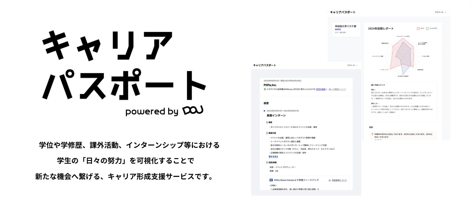 DOUのキャリアパスポートは、学生の「日々の努力」を可視化することで自己成長を促すとともに、新たな機会へと繋げるキャリア形成支援サービスです。