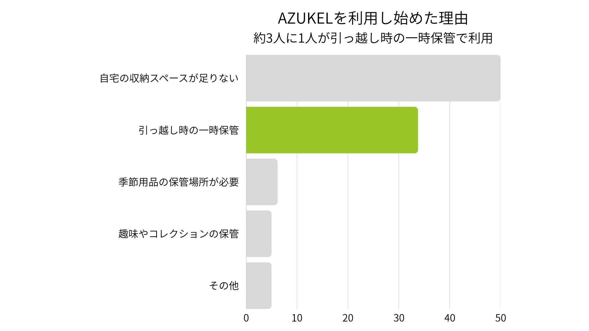 アズケルの利用を始めた最も大きな理由を尋ねたところ、最も多かったのは「自宅の収納スペースが足りない(50.0%)」でしたが、次いで「引っ越し時の一時保管」が33.8%と、高い割合を占めました。