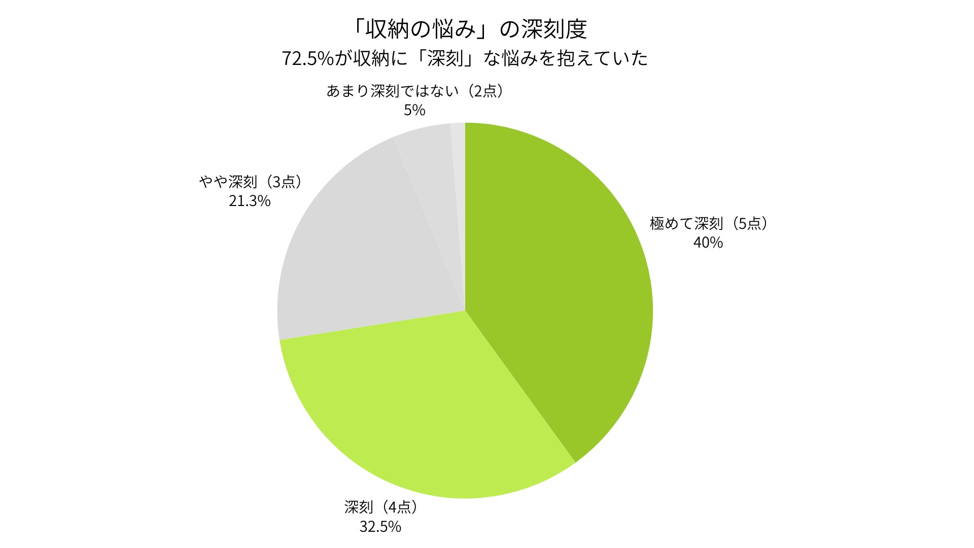アズケル利用前の「収納に関する悩み」の深刻度を5段階(5:極めて深刻〜1:全く深刻ではない)で質問したところ、「極めて深刻(5点)」と回答した人が40.0%、「深刻(4点)」が32.5%となり、全体の72.5%が「深刻以上」の悩みを持っていたことが分かりました。