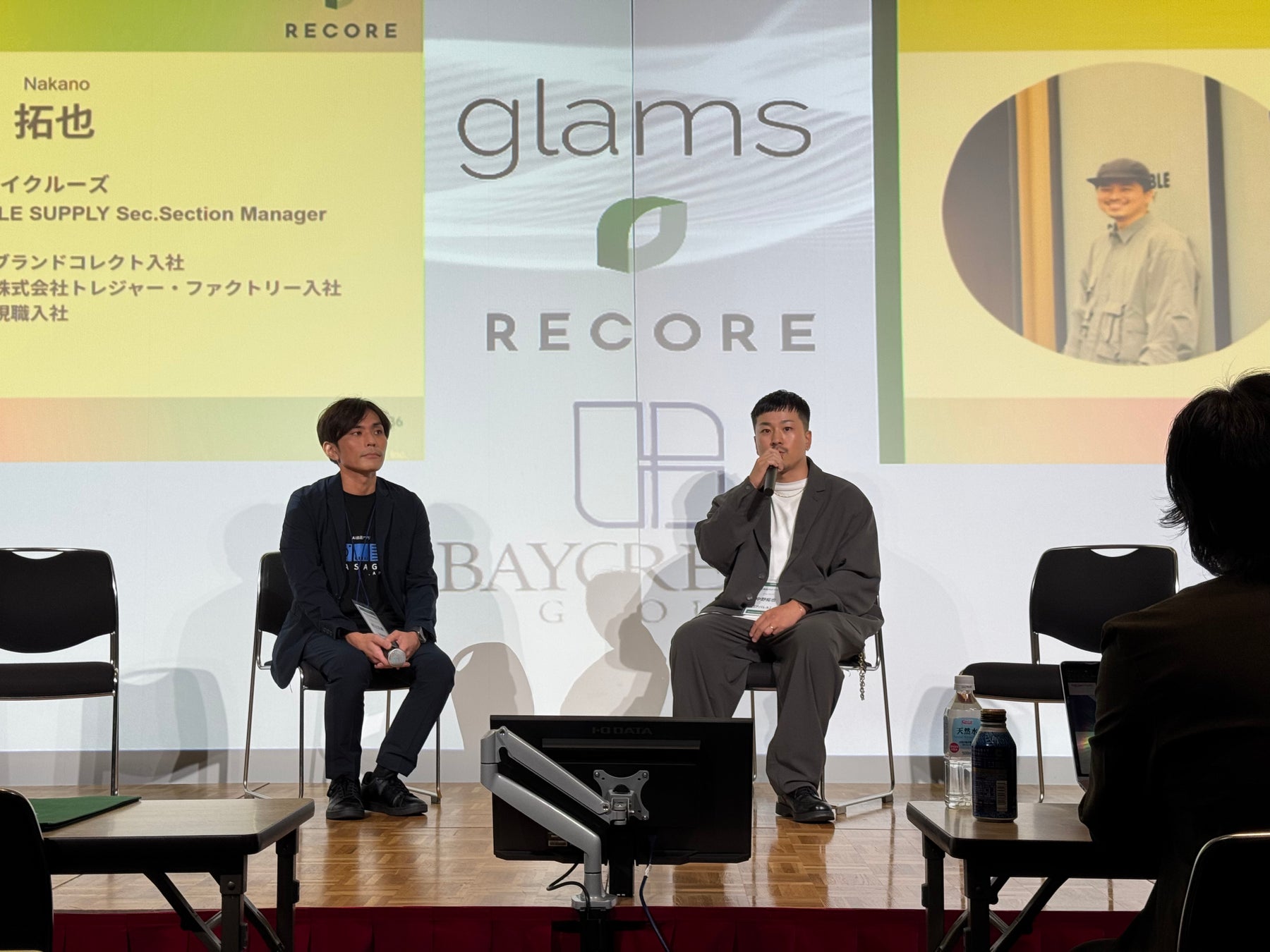 トークセッション1:ささげ業務効率化事例 株式会社ベイクルーズ CIRCULABLE SUPPLY Section Manager 中野拓也様と 、グラムス株式会社 取締役 村上正継様が登壇 。RECOREとグラムス社の「SASAGE.BPO ForREUSE」の連携により 、出品点数が3.5倍 、EC売上伸び率300%を達成した事例が紹介されました 。