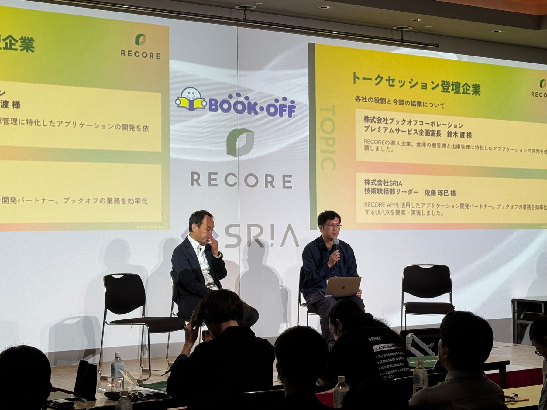 株式会社SRIA 佐藤琢巳様が登壇 。RECORE APIを活用して専用の倉庫管理アプリ「ロジAPP」を開発し 、出品効率を約200%にアップした事例が共有されました 。