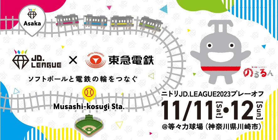 ニトリJD.LEAGUE 2023は、東西地区上位チームによるプレーオフを等々力球場(神奈川県川崎市)で、次いで、日本一決定戦となるダイヤモンドシリーズを朝霞中央公園野球場(埼玉県朝霞市)で開催することに伴い、等々力エリアに武蔵小杉駅や新丸子駅を構え、かつ、朝霞駅を所管する東武鉄道と相互直通運転を行う東急電鉄株式会社とのコラボ企画を実施いたします。