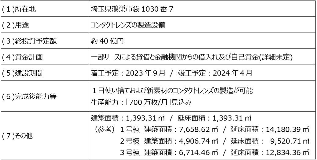 以上の計画に加え、国内外でのコンタクトレンズの需要拡大への対応を背景として、安定した商品供給と今後の成長戦略を実現するため、2号棟を延伸し別館の建築をすることといたしました。当社主力製品の「シード1dayPureシリーズ」を中心に生産体制を強化することで、2号棟別館完成後の鴻巣研究所の生産能力は、「6,500万枚/月」となる見込みです。