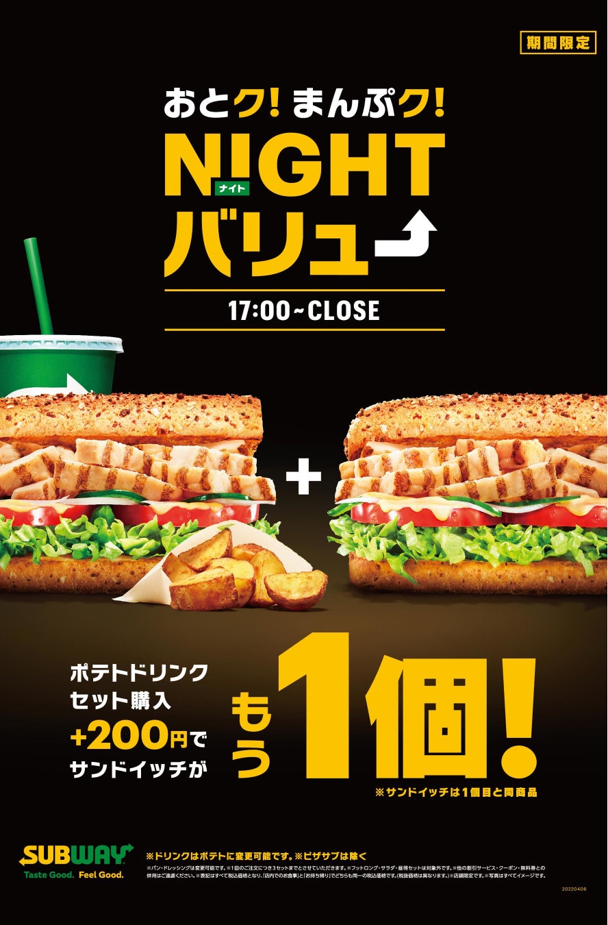 頑張るアナタをサブウェイが応援!プラス200円でサンドイッチがもう1個ついてくるお得な夜限定セット「NIGHTバリュー」がスタート 2022年4月13日(水)よりサブウェイ全店で販売開始