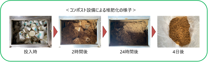使用済み紙コップは、スタジアムに設置された食品残渣発酵分解装置で食品残渣物などと一緒に1次発酵を行います。1次発酵物は、堆肥場にて2次、3次発酵を行ったのち、野菜の栽培に利用できる堆肥に生まれ変わります。2022年のシーズンを通して、このような紙コップを起点とした循環型システムの実証実験を行います。