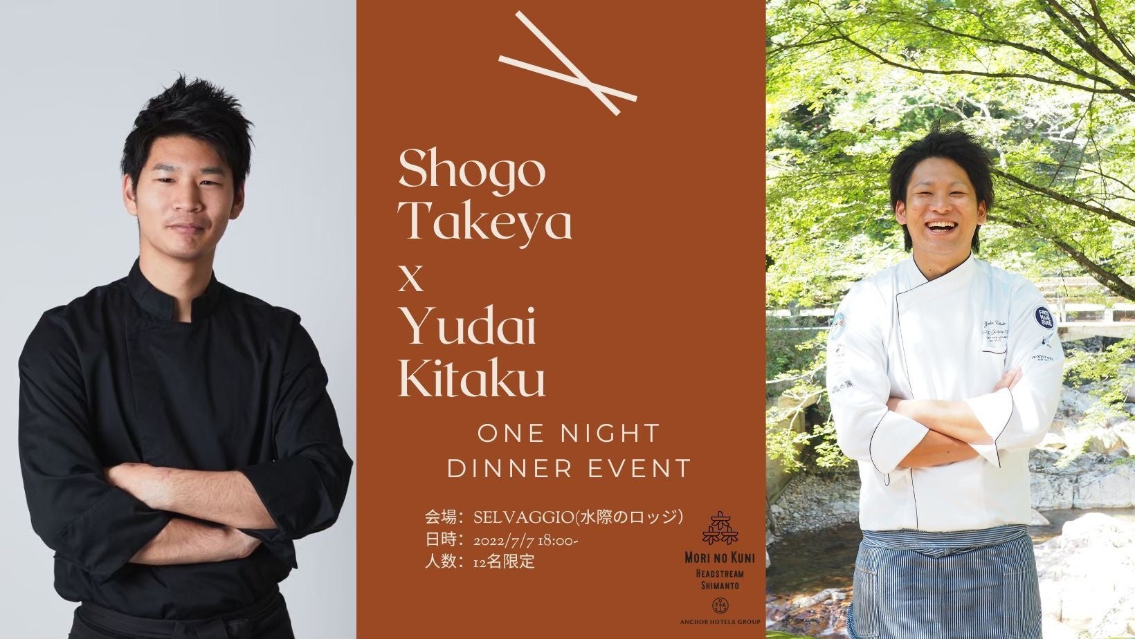 四万十川源流、森の国「水際のロッジ」(所在地:愛媛県北宇和郡松野町目黒 滑床渓谷、マネージャー:湯之上美紀、以下 水際のロッジ)併設レストラン「SELVAGGIO」(料理長:北久裕大、読み方 セルバッジオ)では、2022年7月7日のディナーにて竹矢匠吾シェフと北久裕大シェフがコラボ。『Shogo Takeya x Yudai Kitaku One Night Dinner Event』と称し、一夜限りの七夕スペシャルディナー付の宿泊プランを12名様限定で販売します。