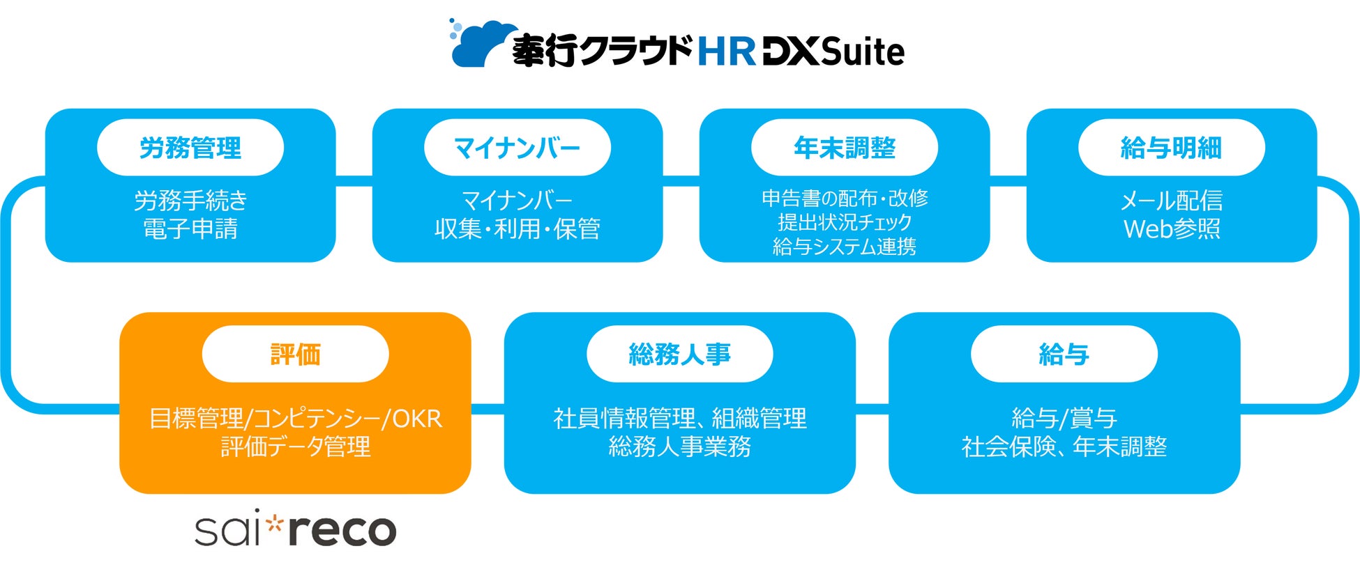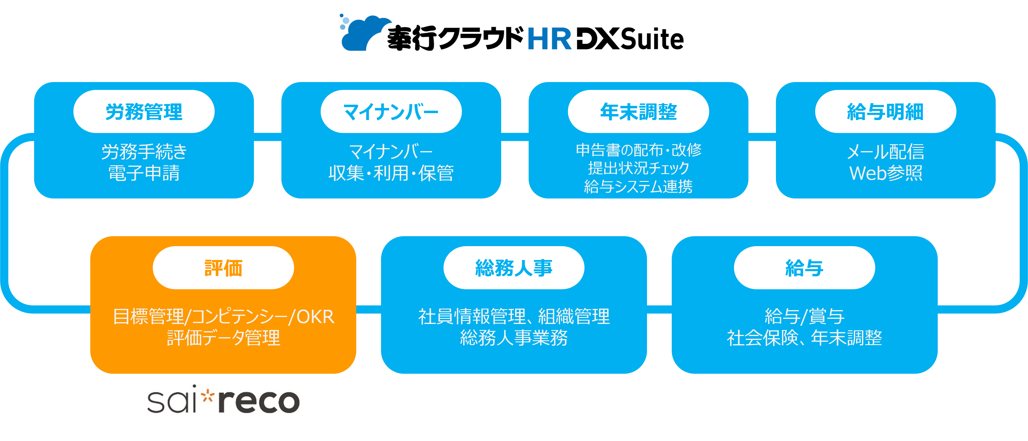 サイレコでは、基本機能に加えて評価機能をご導入いただくことで、人事評価制度運用の効率化および評価情報の可視化による効果的な人事施策の実現を可能にします。今回、奉行クラウドシリーズ「総務人事奉行クラウド」とサイレコを連携することで、「総務人事奉行クラウド」に蓄積した従業員情報をサイレコへ連携できるようになります。