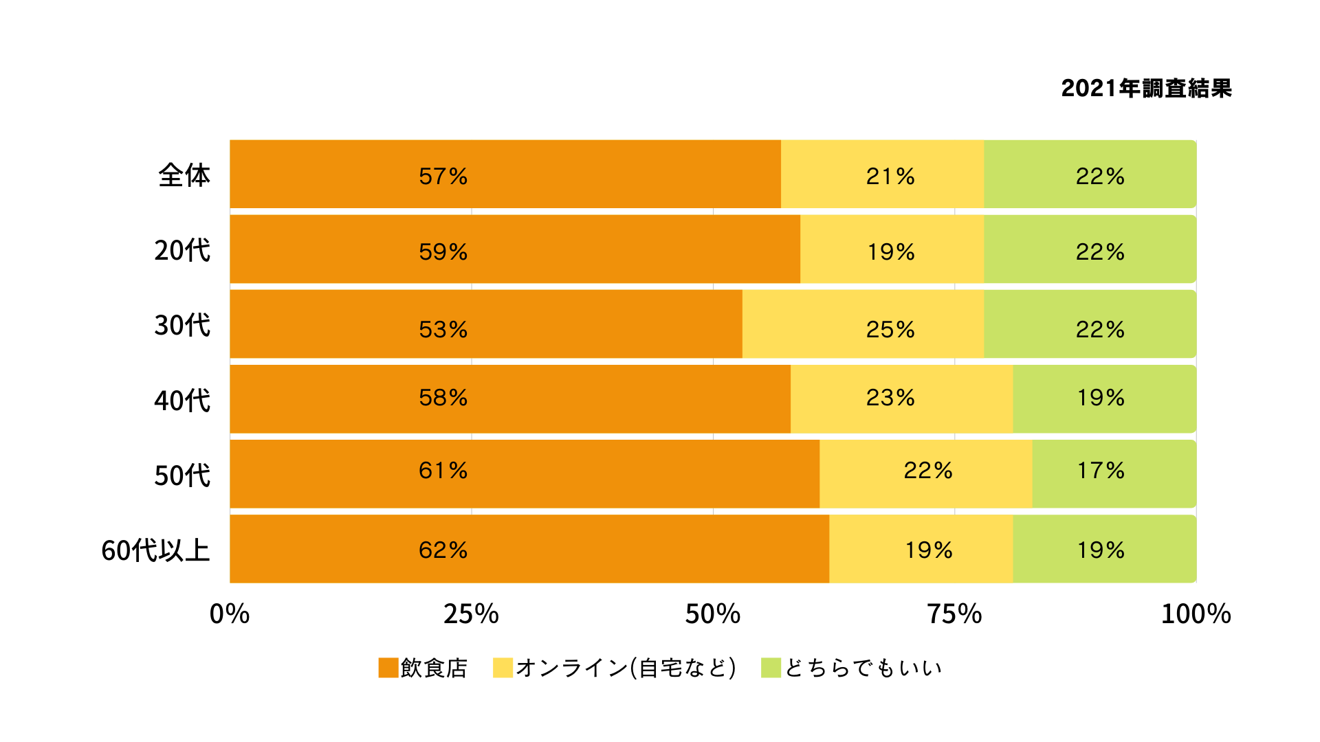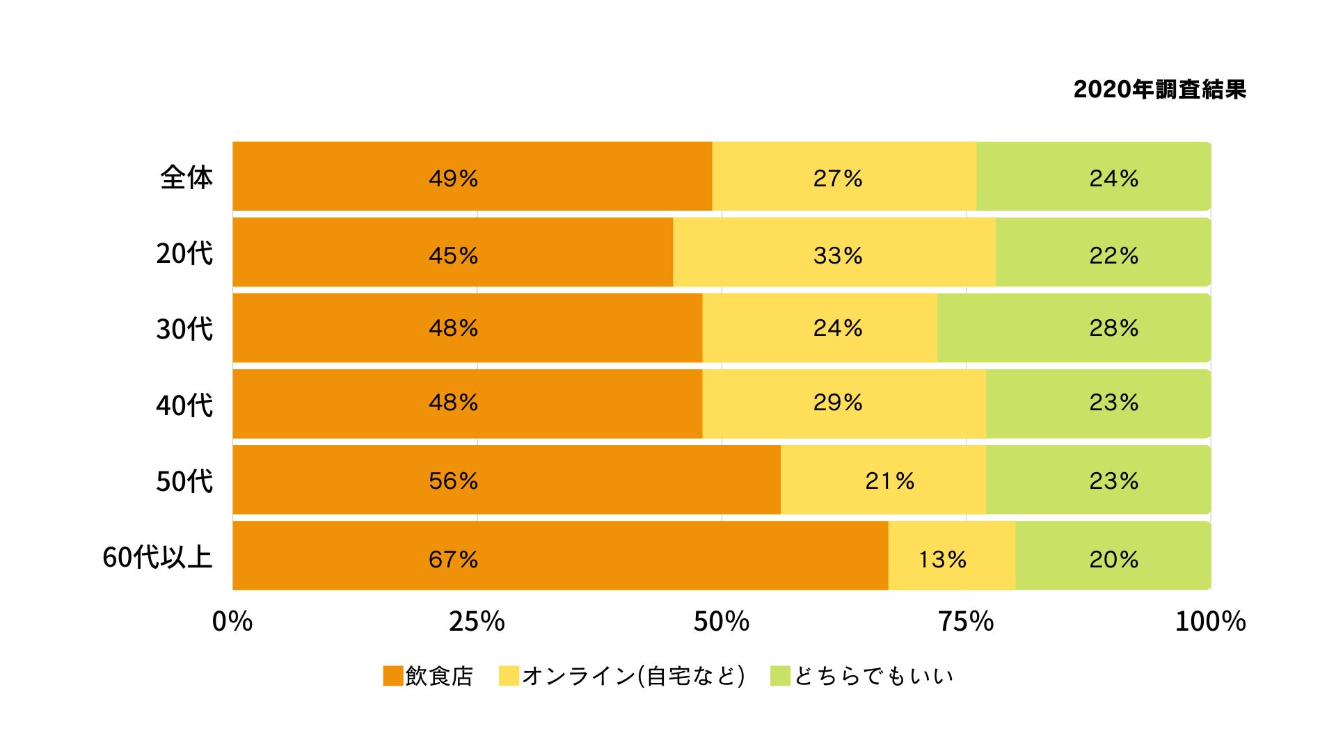 2022年の新年会を実施する予定の人は19%。昨年の調査結果から6%増加していることがわかりました。実施すると回答したほとんどは3回以内の開催を予定しており、昨年よりも2~3回を選択する方が20代、40代で多くなっています。飲食店で新年会を行いたいとする人は57%。新年会を実施する割合は多くはありませんが、昨年よりもわずかに新年会に対して前向きな結果がみられています。