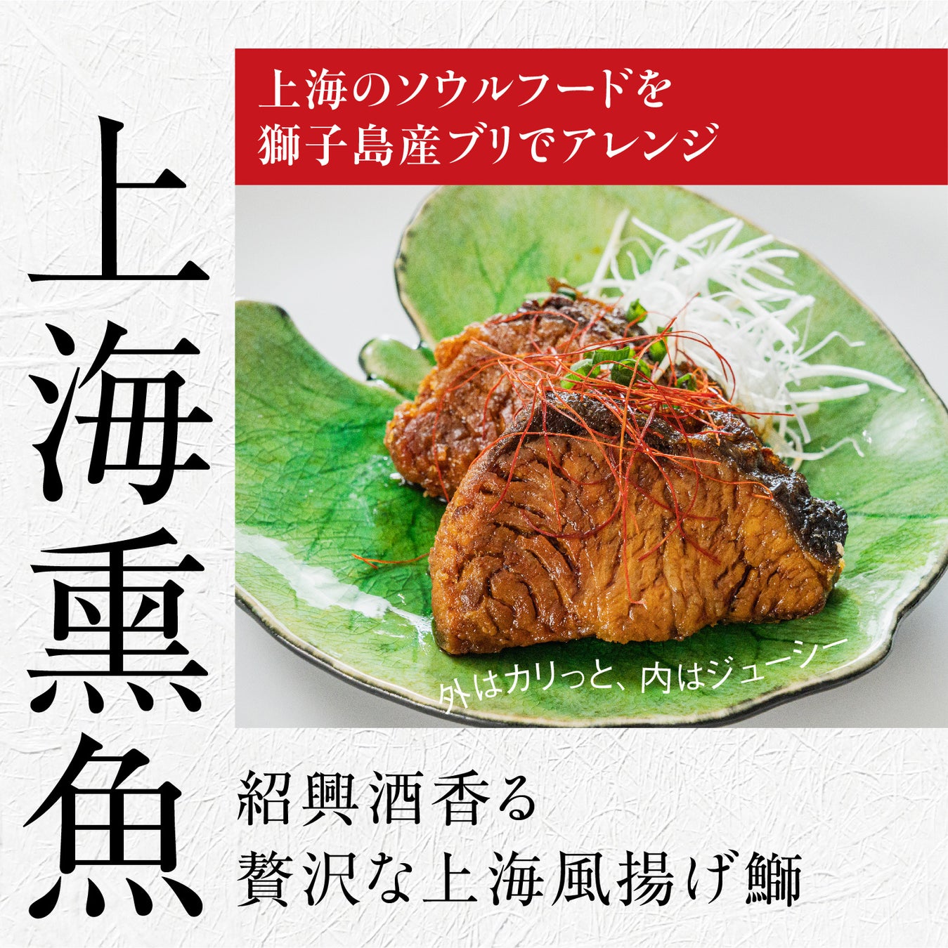 島自慢の脂がのった鰤をカラッと素揚げし、紹興酒を贅沢にたっぷりと使った上海風の特製醤油ダレに漬け込みました。紹興酒香る、リッチな味わいをどうぞお楽しみください。