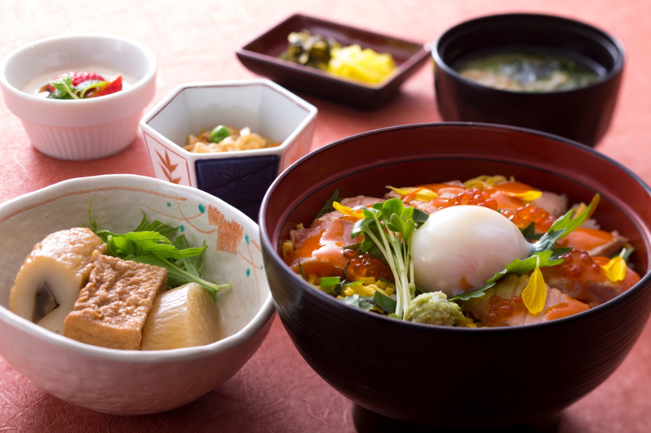 半熟の温度玉子やいくらもトッピングし、雲丹醤油で仕上げた炙りサーモン丼がメインのお値打ち定食。寒い時期にうれしい名物のおでん3種も登場します。