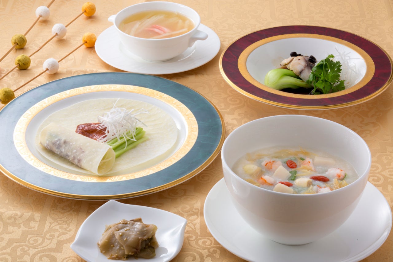 大人気の北京ダック包みが2本付くほか、蟹肉と白菜のとろみスープ、旨み溢れる寒ブリの煎り焼き豆鼓ソース、エビ・帆立・干し貝柱の滋味豊かな五目海鮮粥など、華やかで緩急あるメニュー構成。ミニデザートも付いた大満足のコースを心ゆくまでどうぞ。