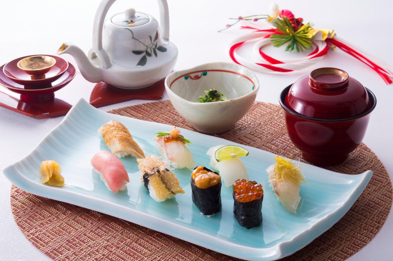 にぎり8貫は、いずれ劣らぬ人気ネタが集結。本鮪とろ、縁起も味も良い子持ち昆布、北海道の生雲丹やいくら、特製ダレで煮た穴子、小鯛柚子昆布〆の他、近海の旬魚介がラインナップ。小鉢や赤だし、デザートも付いた祝いの昼膳をお愉しみください。