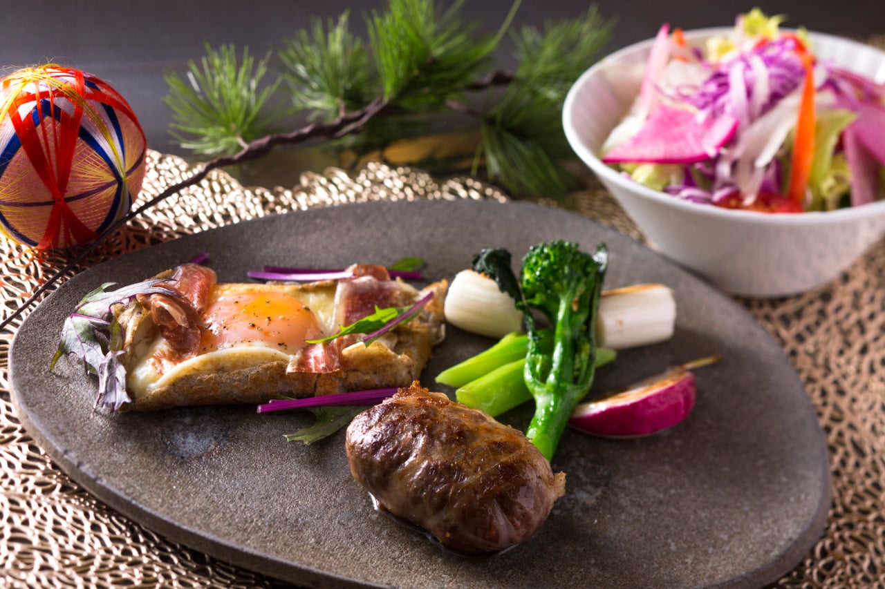 近江牛の雌牛ミンチ肉のみで作るクレピネットハンバーグは溢れ出す濃厚な旨みに圧倒される逸品。その他、スペイン産生ハムや半熟玉子をのせた滋賀・伊吹在来種そば粉のガレット、いちごのクレープシュゼットなども華を添える充実のコースをこの機会に。
