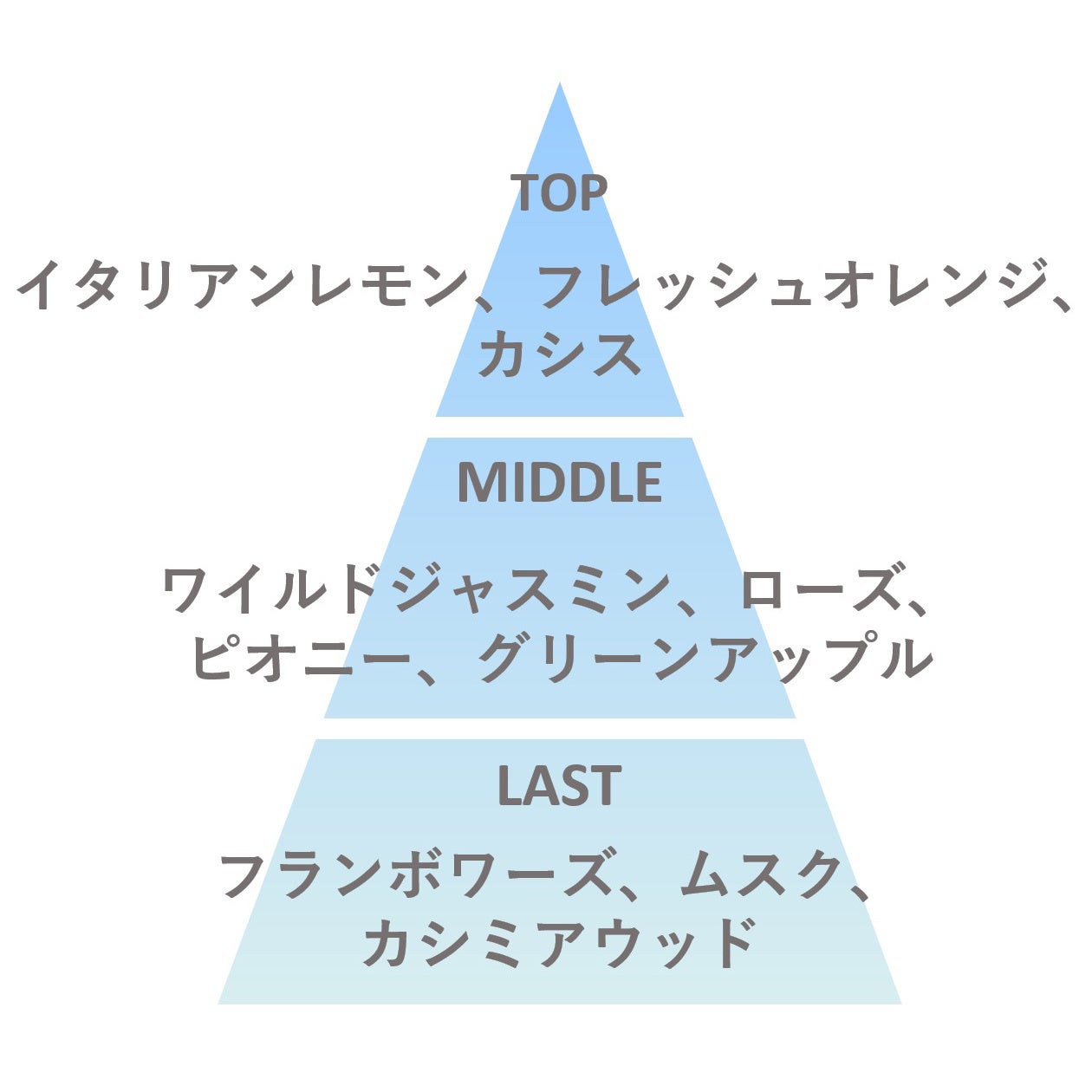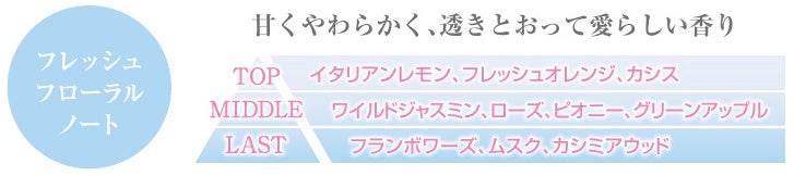 上質なレモンやオレンジに甘酸っぱいカシスを添えたトップノートはフレッシュな印象です。透明感にあふれ甘さと優しさが広がるジャスミンや、穏やかな花々が重なるミドルノートは香りの花束のよう。そしてキュートな甘さのフランボワーズ、落ち着いたムスク、上品なカシミアウッドが溶け合い、いつまでも包まれていたくなるような心地よいラストノートが続きます。