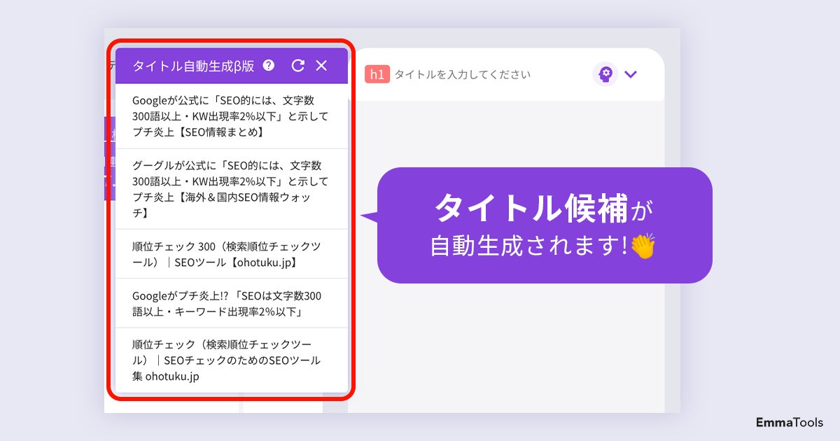 EmmaToolsのタイトルおよび見出し構成の自動生成機能では、SEO対策がされた複数の候補を選択肢としてレコメンドしてくれます。
