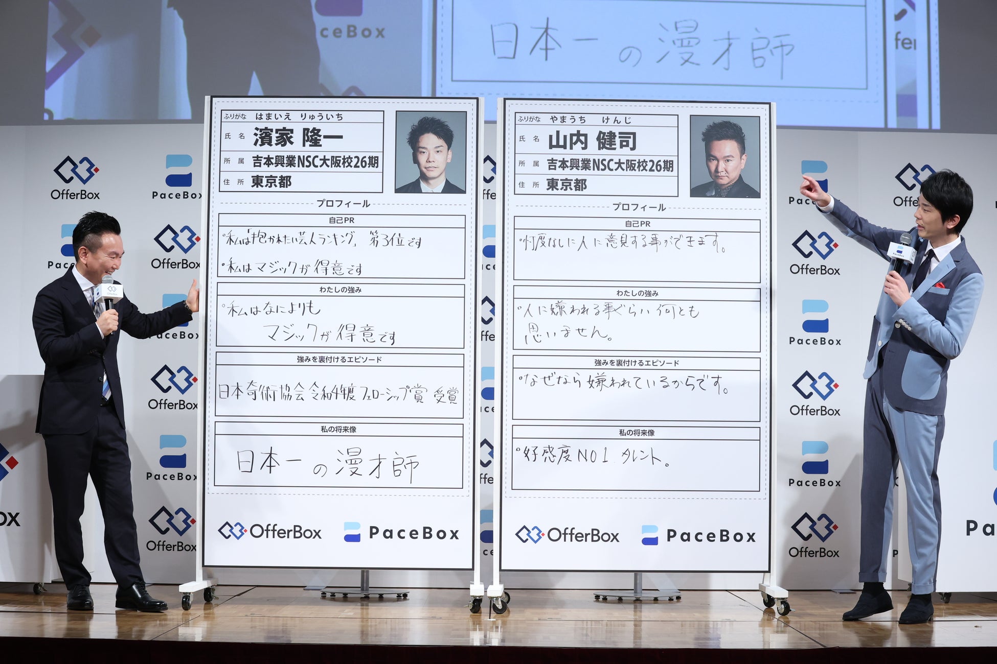 また、OfferBox、PaceBoxのオファー型という特長と絡めて、もし新たなコンビを組むとしたら、誰にオファーしたいですかという質問に対しては、濱家さんが「僕は山内しか考えられないですね」と「僕はオール巨⼈師匠ですね。賞レースの決勝まで⾏けば低い点数つけられなくなると思うので」と回答。濱家さんがツッコみ会場の笑いを誘いました。
