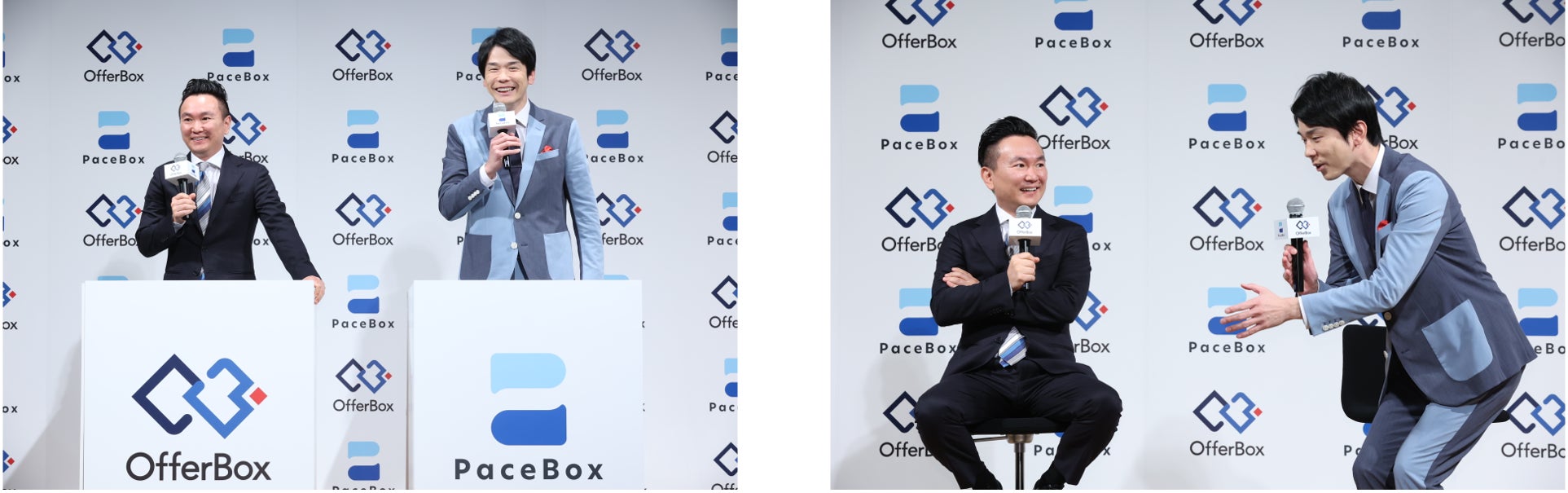 次に、同社取締役COO 直木英訓より就活サービス「OfferBox」の紹介を行い、最後に株式会社pacebox 代表取締役 秋澤大樹が今年8月にローンチした転職サービス「PaceBox」のサービス説明を行いました。「OfferBoxは2023年卒において、「OfferBoxとPaceBoxはオファー型の就活・転職サービスです。就活生や転職希望者にとって新たな気づきや企業との出会いの可能性を提供しています」と力強く語りました。