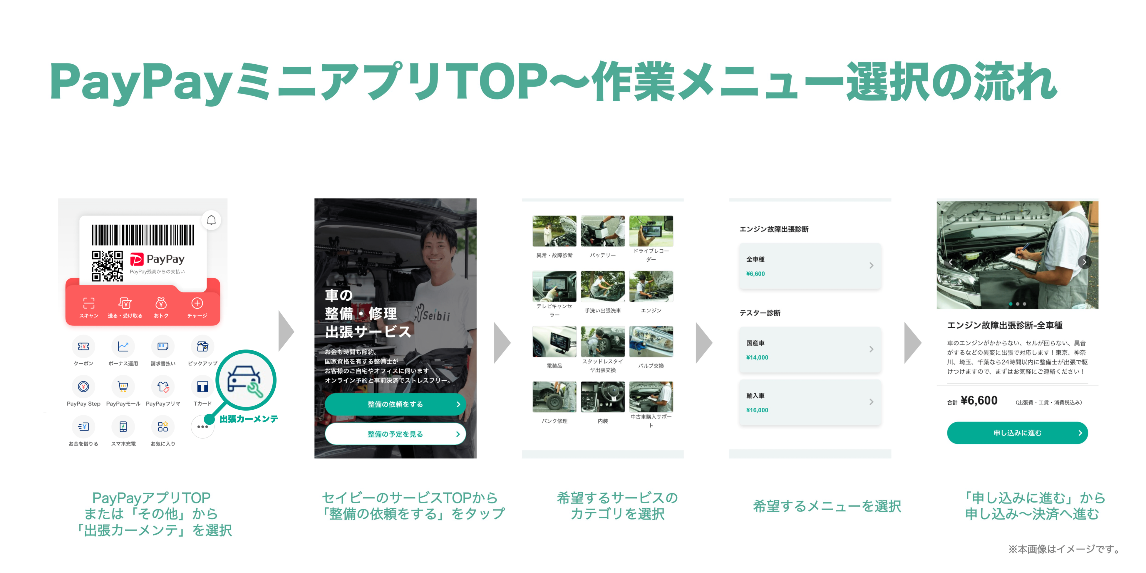 「Seibii」は、スマホ、ネットから簡単に相談や依頼ができる、国家資格を持つ整備士による車の整備、修理、パーツ取付などの出張サービスです。これまで、「Seibii」では整備士向けのアプリを提供しており、車の整備や修理を依頼したい利用者はウェブから申込むことでサービスが利用できました。今回の取り組みにより、PayPayアプリをご利用のユーザーは、申し込みから支払いまでPayPayアプリで完結でき、利便性が向上します。