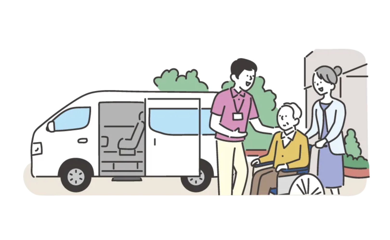 通所介護施設では、ご利用者様が送迎車両で施設に到着した際、安全に降車して施設に移動できるよう、施設内にいる職員がお出迎えして確実な介助を行います。