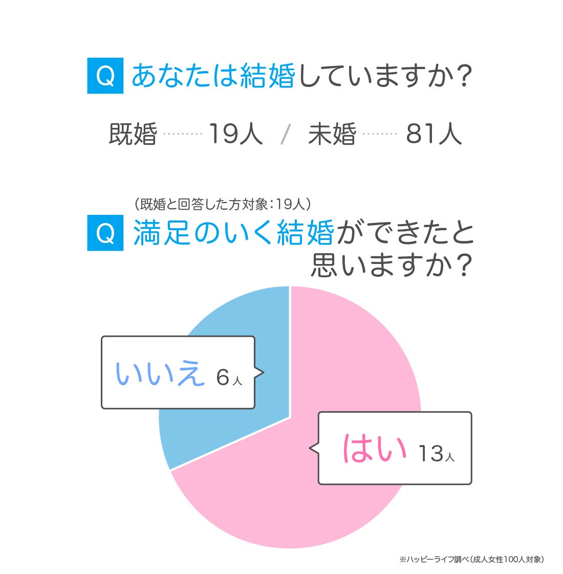 続いて、結婚している人に満足のいく結婚ができたか聞いたところ、約7割の人が充実した結婚生活を送っていることがわかりました。