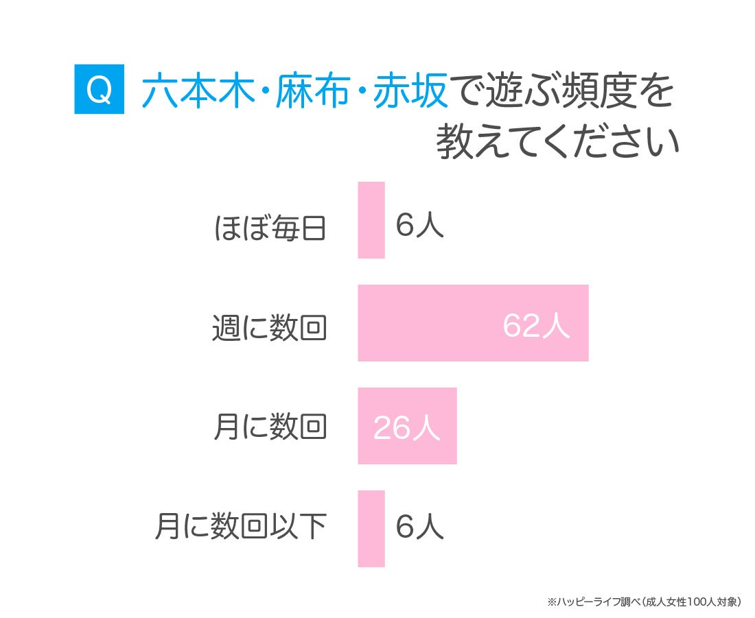 六本木・麻布・赤坂で遊ぶ頻度を聞いてみたところ、「週に数回」と回答した人が6割を超えていました。