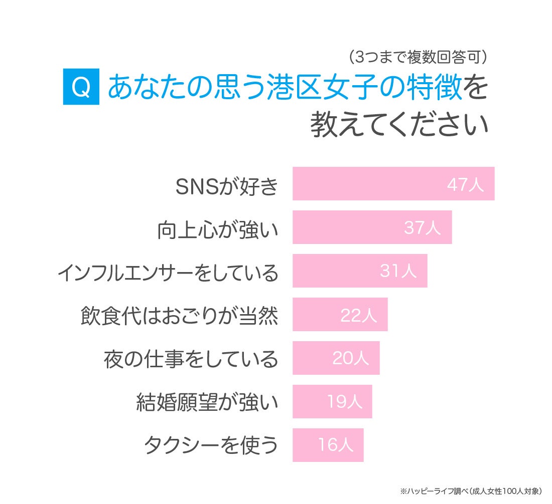 今回の記事では、累計会員数3500万(※1)を誇る出会い・恋愛マッチングアプリ・サービス「ハッピーメール( https://happymail.co.jp/ )(運営:株式会社アイベック 本社:福岡県福岡市)」にて、港区女子である成人女性100人を対象に、「港区女子」に関するアンケート調査を実施しました。