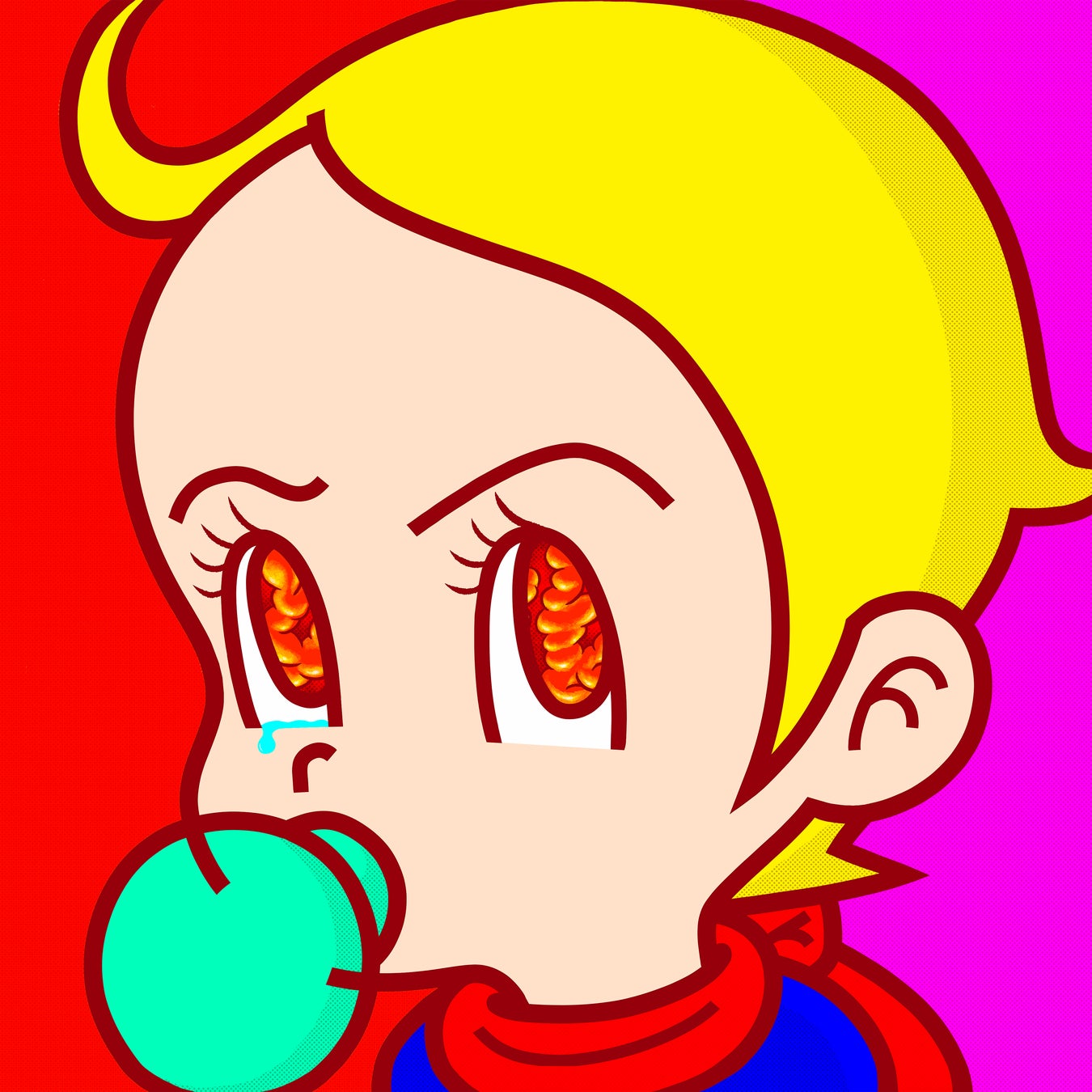 手島領の作品は、独自のキャラクター「BABYBOY」を中心に展開され、そのビジュアルにはポップなネオンカラーが多用されています。その鮮やかな色彩の裏には、社会問題や現代に生きる私たちの姿が映し出されており、単なるポップアートにとどまらない深みを持っています。