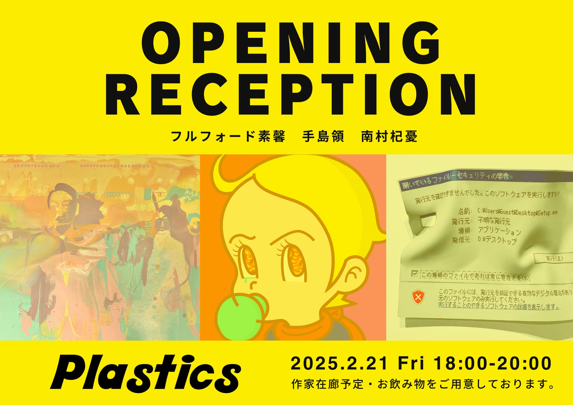 今注目のアーティスト・手島領、南村杞憂、フルフォード素馨による3人展「Plastics」を開催 !