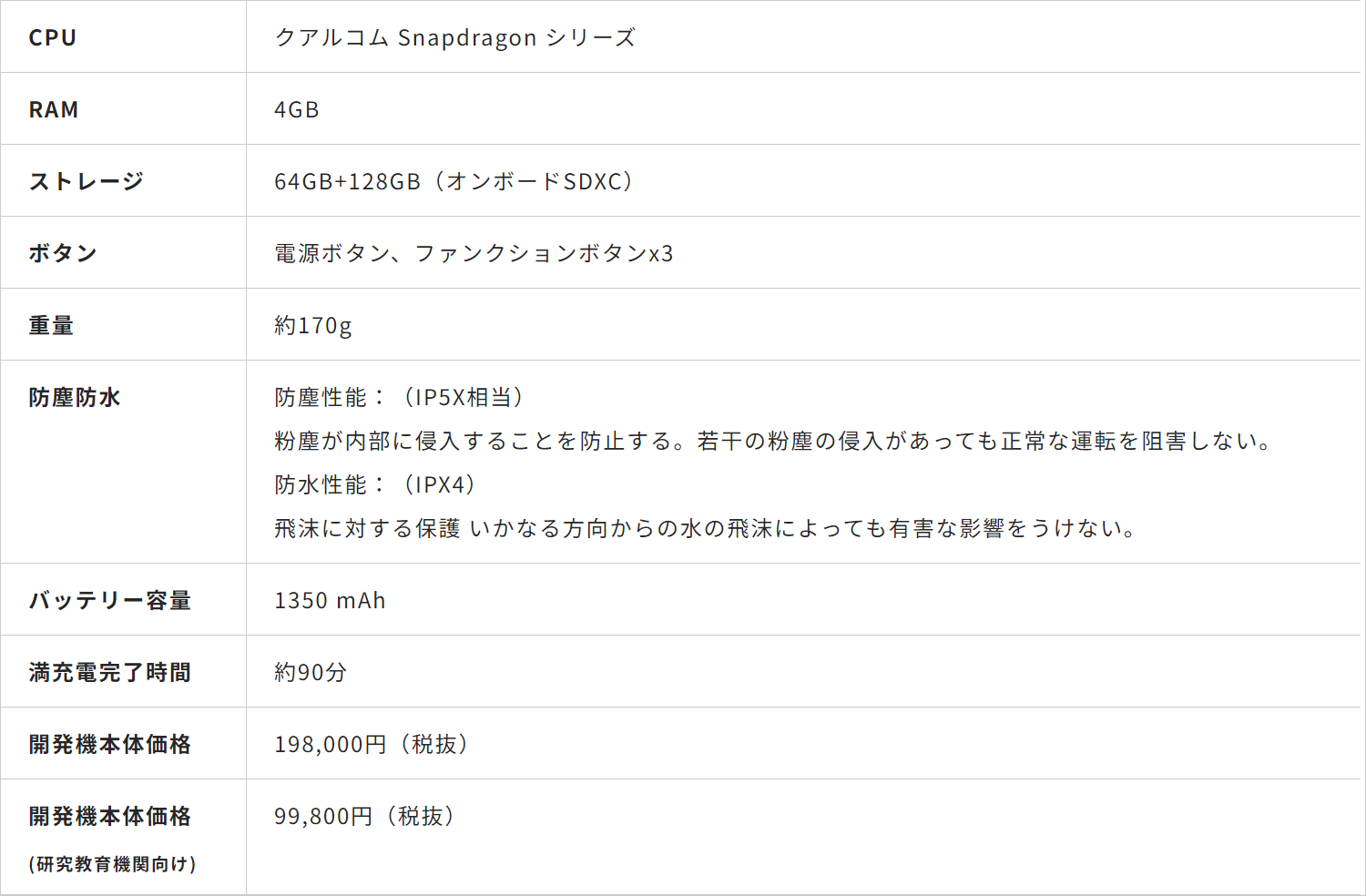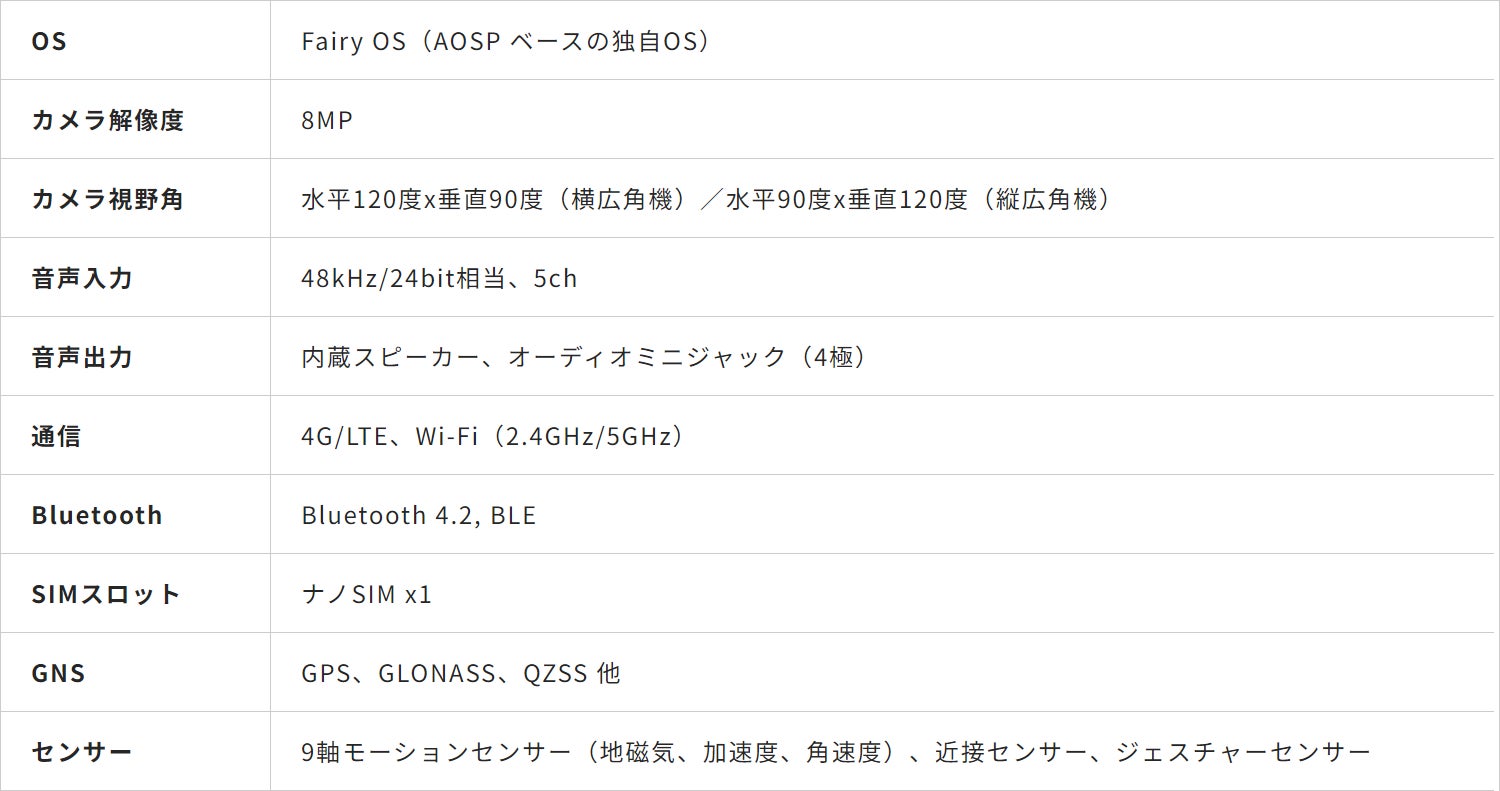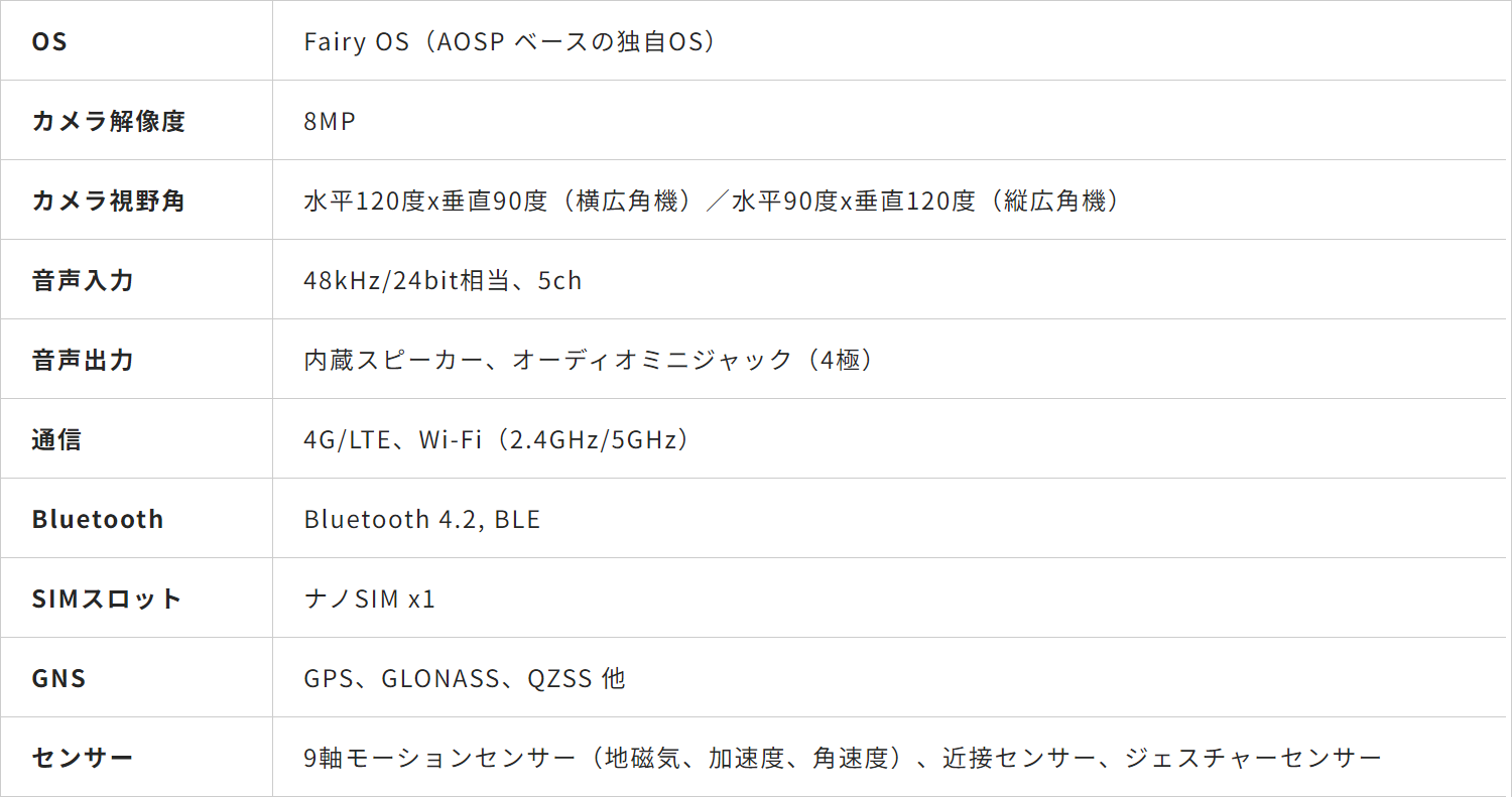 ・AOSP(Android Open Source Project)ベースの独自OSである「Fairy OS」が動作しています。ハードウェア機能を制御するためのソフトウェアは SDK として提供されており、一般の Android 向けのアプリケーションを動作させることができます(一部技術的制約があります)。
