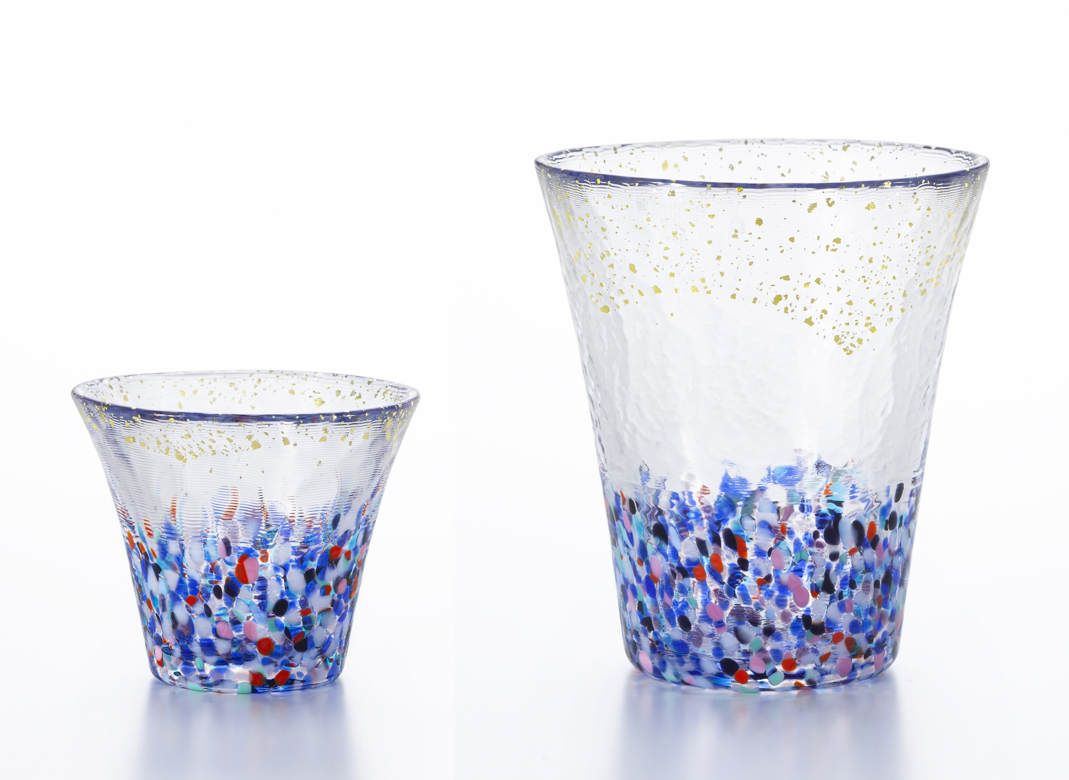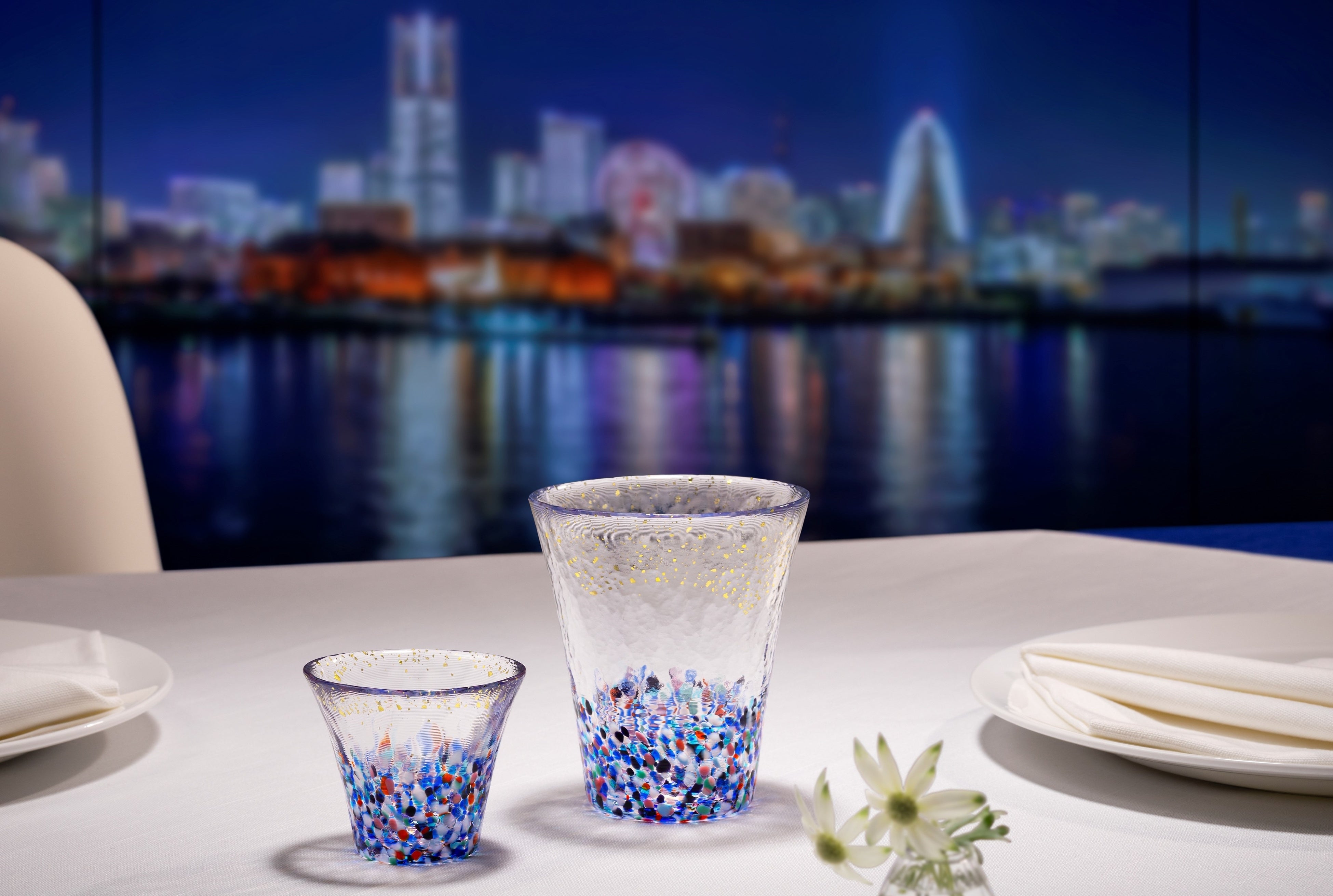 異国情緒あふれる港の街並み、海沿いに立ち並ぶ高層ビル群、そして水面に映るネオンの光。都市と海が調和する幻想的な横浜の夜景をグラスで表現しました。どこか異国の雰囲気を感じさせる色合いと金箔が施された特別仕様で、優雅なひとときをお楽しみください。