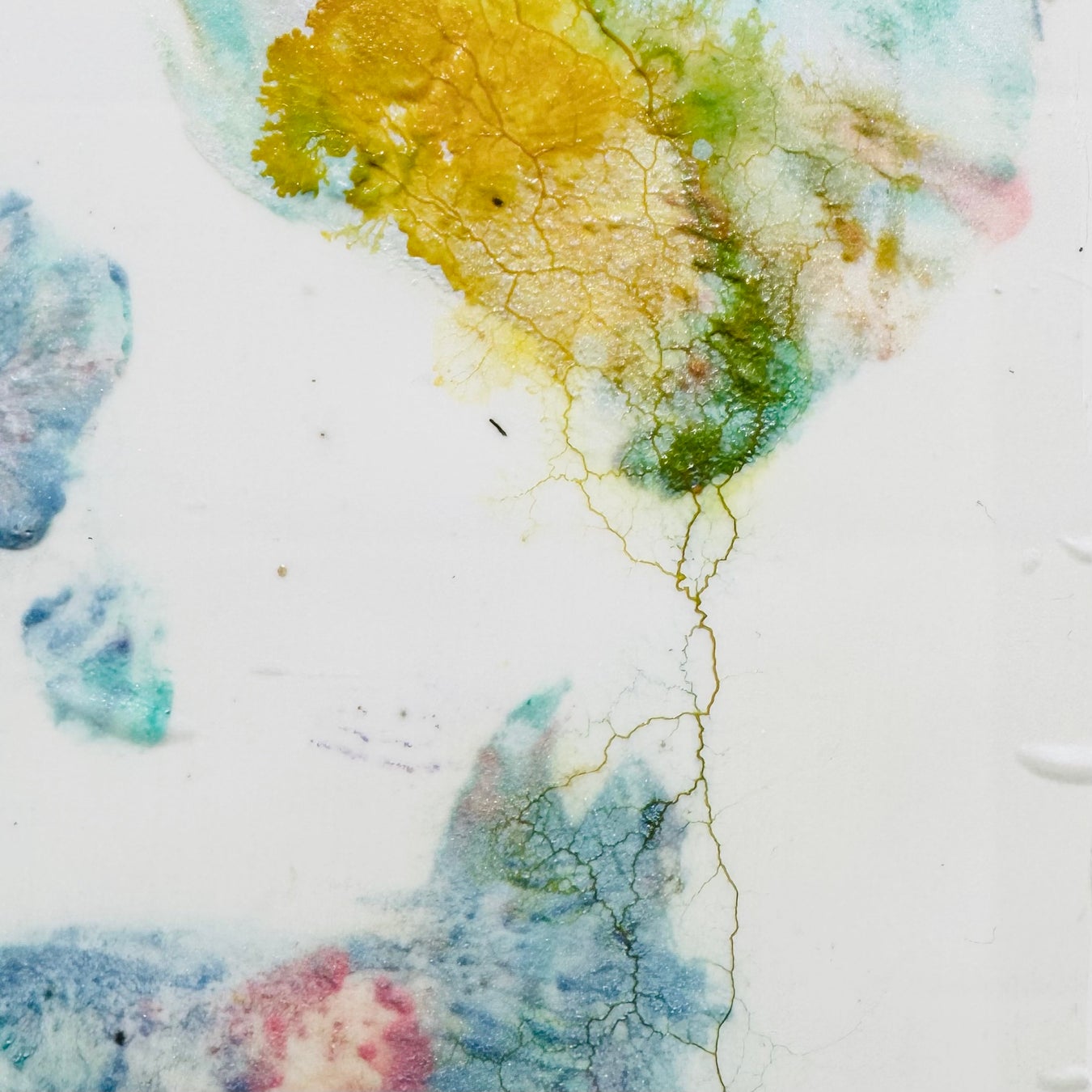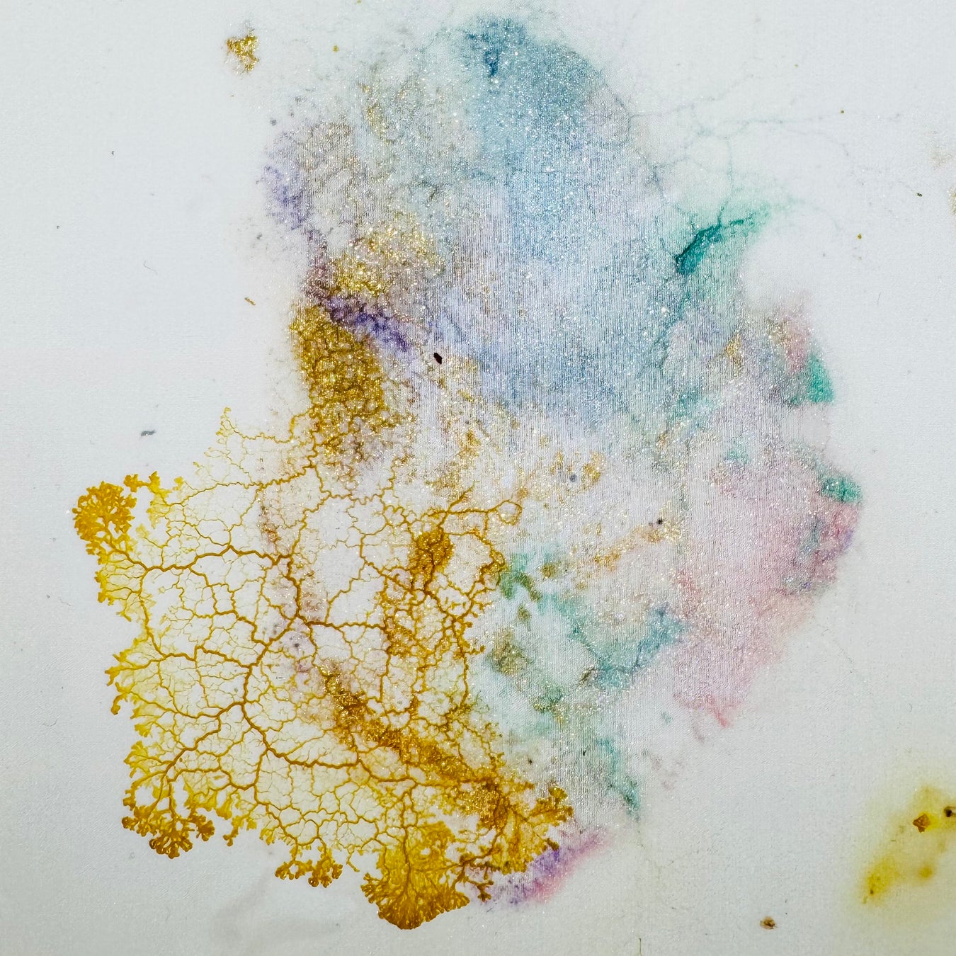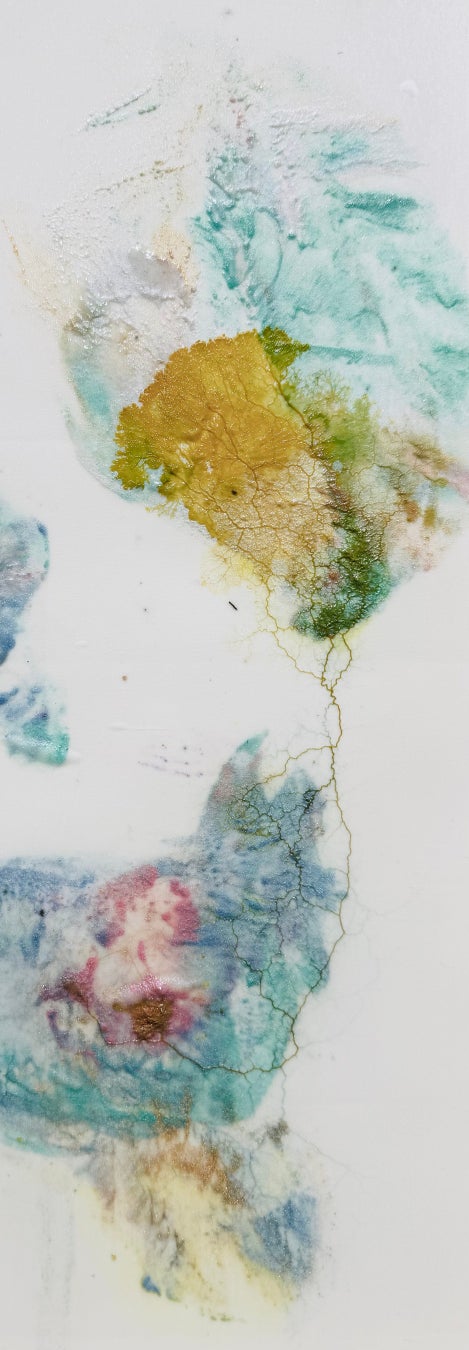 きらきらのグリッターは齋藤の身体に塗布された時には「化粧」や「装飾」といった文化的表象として機能する素材ですが、真性粘菌が代謝する過程では「マイカ(雲母)」や「酸化チタン」といった自然界の鉱物や金属酸化物などの物質へと還元されます。また、布に残った齋藤の痕跡は離れて見れば等身大の身体パー ツとして認識される一方で、近接視ではサフマン・テイラー不安定性によるパターン形成や、真性粘菌の代 謝による樹状の痕跡が交差し、人工物と自然物の境界を解きほぐすような視覚効果を生み出しています。“自然と文化という古典的二項対立をより流動的なものとして捉えたい”と語る齋藤の実践の中でも、とりわけ新たな魅力を放つ作品です。